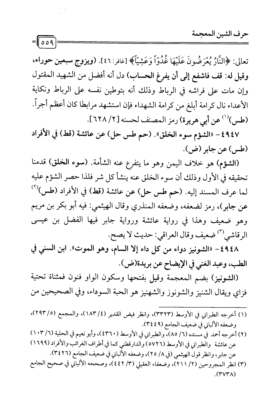 4948 - "الشونيز دواء من كل داء إلا السام، وهو الموت". ابن السني في الطب، وعبد الغني في الإيضاح عن بريدة (ض).