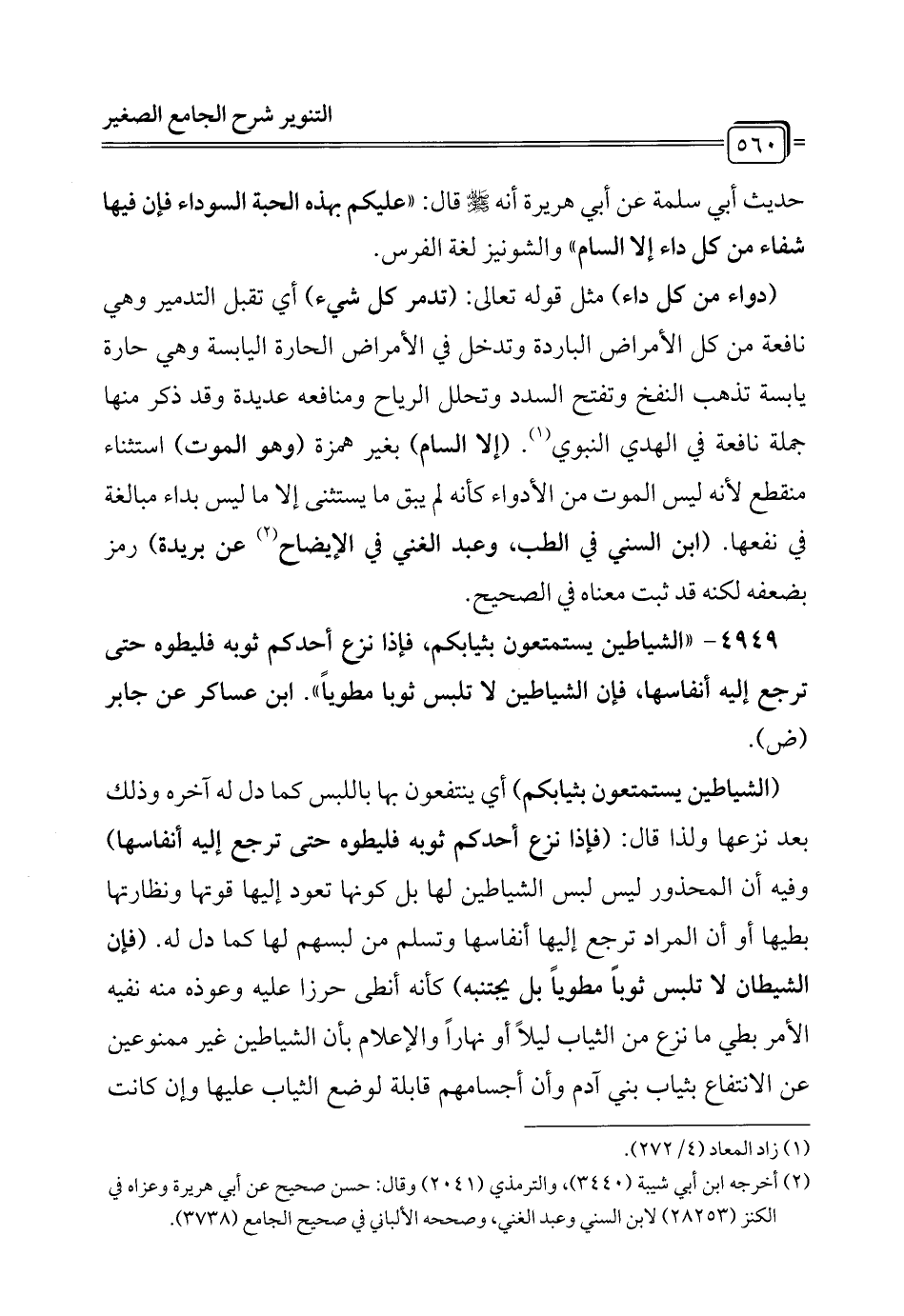 (دواء من كل داء) مثل قوله تعالى: (تدمر كل شيء) أي تقبل التدمير وهي نافعة من كل الأمراض الباردة وتدخل في الأمراض الحارة اليابسة وهي حارة يابسة تذهب النفخ وتفتح السدد وتحلل الرياح ومنافعه عديدة وقد ذكر منها جملة نافعة في الهدي النبوي (¬1). (إلا السام) بغير همزة (وهو الموت) استثناء منقطع لأنه ليس الموت من الأدواء كأنه لم يبق ما يستثنى إلا ما ليس بداء مبالغة في نفعها. (ابن السني في الطب، وعبد الغني في الإيضاح (¬2) عن بريدة) رمز بضعفه لكنه قد ثبت معناه في الصحيح.
