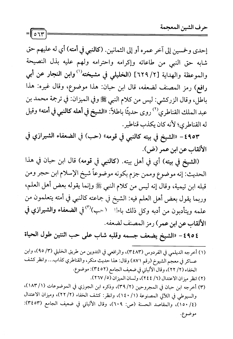(الشيخ في بيته) أي في أهل بيته. (كالنبي في قومه) قال ابن حبان في هذا الحديث: إنه موضوع وممن جزم بكونه موضوعاً شيخ الإِسلام ابن حجر ومن قبله ابن تيمية، وقال إنه ليس من كلام النبي - صلى الله عليه وسلم - وإنما يقوله بعض أهل العلم، وربما يقول بعض أهل العلم فيه: الشيخ في جماعته كالنبي في أمته يتعلمون من علمه ويتأدبون من أدبه وكل ذلك باطل (حب) (¬3) في الضعفاء والشيرازي في الألقاب عن ابن عمر) رمز المصنف لضعفه.