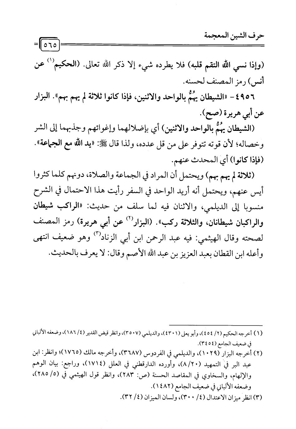 4956 - "الشيطان يهُمُّ بالواحد والاثنين، فإذا كانوا ثلاثة لم يهم بهم". البزار عن أبي هريرة (صح).