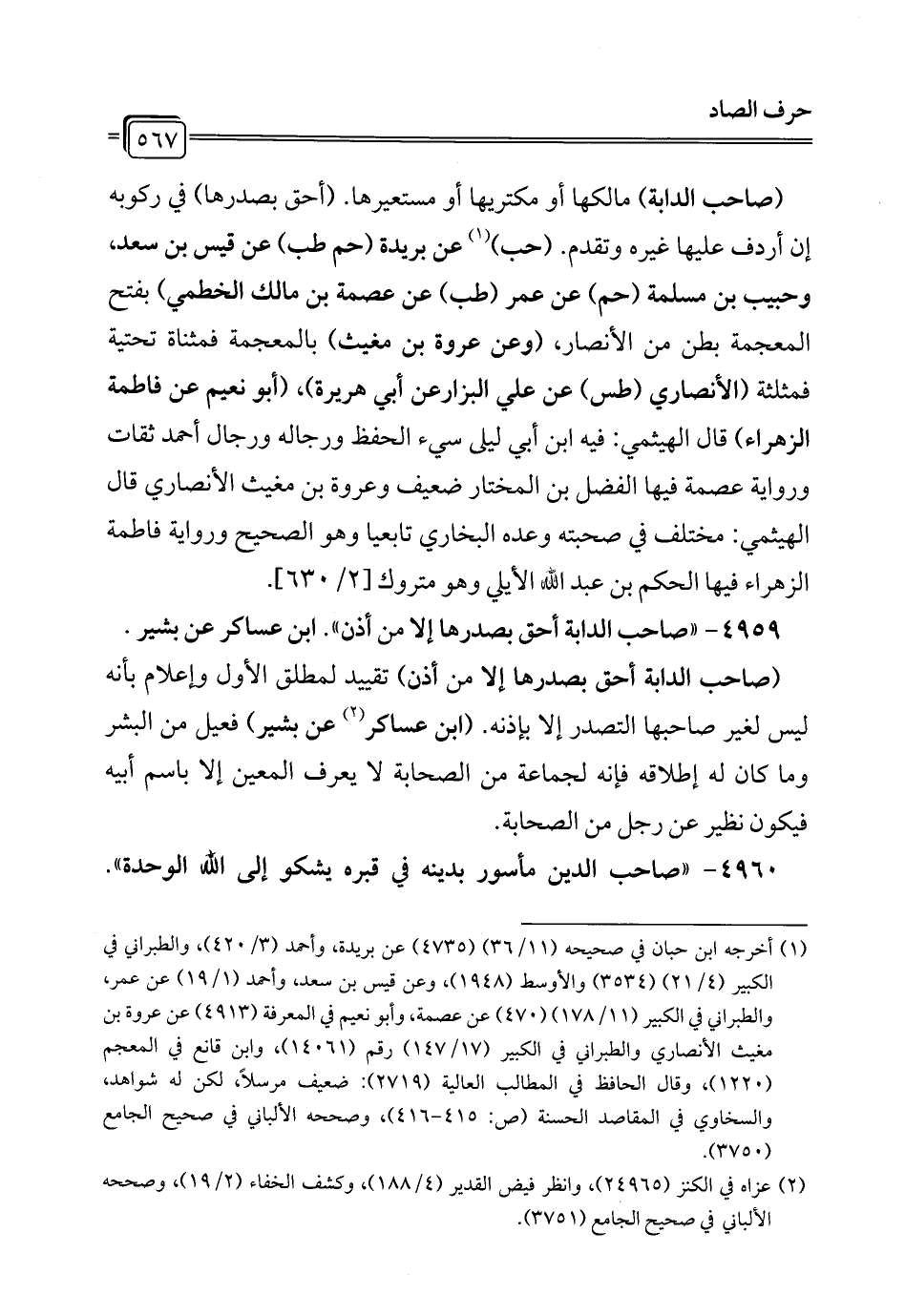 4959 - "صاحب الدابة أحق بصدرها إلا من أذن". ابن عساكر عن بشير.