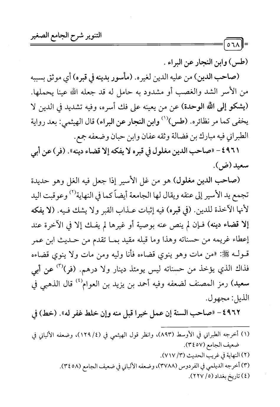 4961 - "صاحب الدين مغلول في قبره لا يفكه إلا قضاء دينه". (فر) عن أبي سعيد (ض).