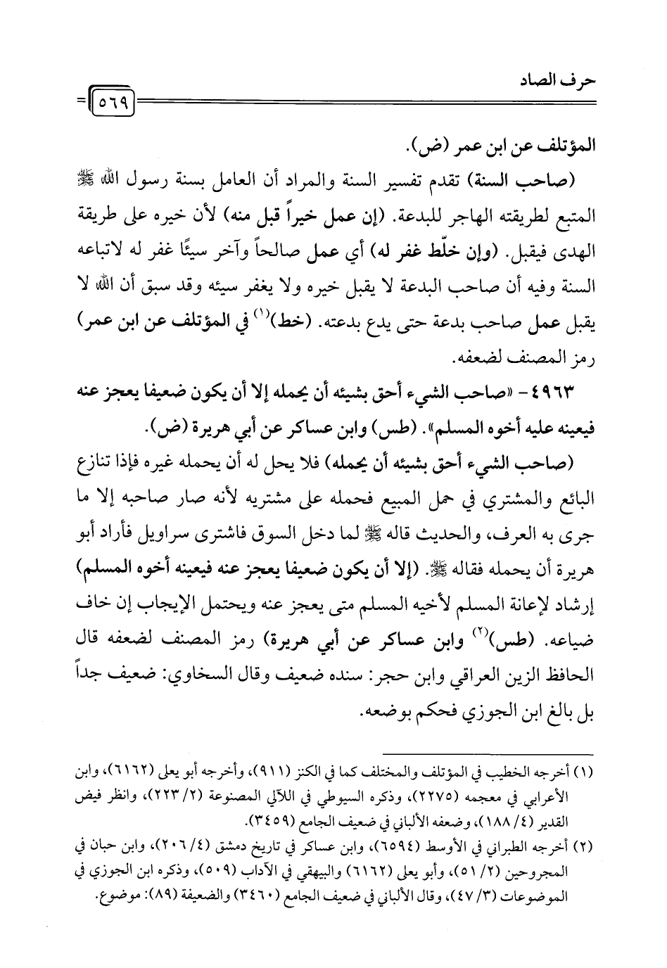 (صاحب الشيء أحق بشيئه أن يحمله) فلا يحل له أن يحمله غيره فإذا تنازع البائع والمشتري في حمل المبيع فحمله على مشتريه لأنه صار صاحبه إلا ما جرى به العرف، والحديث قاله - صلى الله عليه وسلم - لما دخل السوق فاشترى سراويل فأراد أبو هريرة أن يحمله فقاله - صلى الله عليه وسلم -. (إلا أن يكون ضعيفاً يعجز عنه فيعينه أخوه المسلم) إرشاد لإعانة المسلم لأخيه المسلم متى يعجز عنه ويحتمل الإيجاب إن خاف ضياعه. (طس) (¬2) وابن عساكر عن أبي هريرة) رمز المصنف لضعفه قال الحافظ الزين العراقي وابن حجر: سنده ضعيف وقال السخاوي: ضعيف جداً بل بالغ ابن الجوزي فحكم بوضعه.