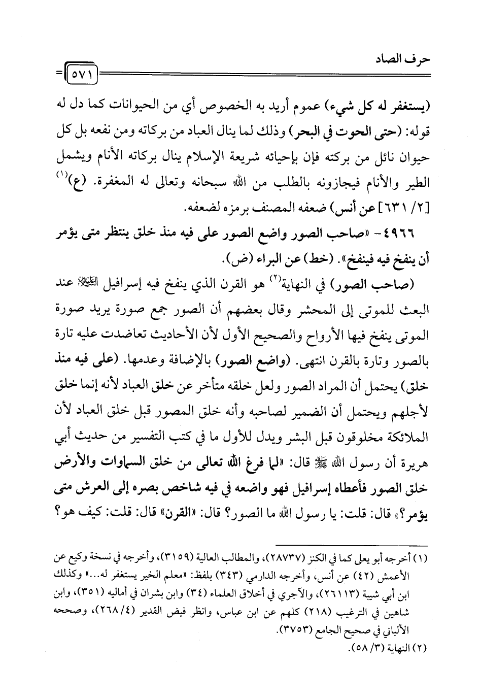 4966 - "صاحب الصور واضع الصور على فيه منذ خلق ينتظر متى يؤمر أن ينفخ فيه فينفخ". (خط) عن البراء (ض).