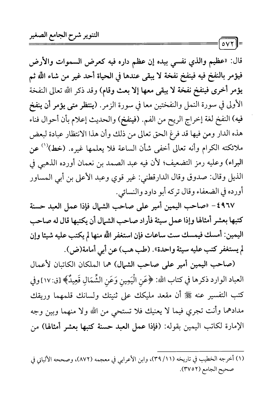 قال: "عظيم والذي نفسي بيده إن عظم داره فيه كعرض السماوات والأرض فيؤمر بالنفخ فيه فينفخ نفخة لا يبقى عندها في الحياة أحد غير من شاء الله ثم يؤمر أخرى فينفخ نفخة لا يبقى معها إلا بعث وقام) وقد ذكر الله تعالى النفخة الأولى في سورة النمل والنفختين معا في سورة الزمر. (ينتظر متى يؤمر أن ينفخ فيه) النفخ لغة إخراج الريح من الفم. (فينفخ) والحديث إعلام بأن أحوال فناء هذه الدار ومن فيها قد فرغ الحق تعالى من ذلك وأن هذا الانتظار عبادة لبعض ملائكته الكرام وأنه تعالى أخفى شأن الساعة فلا يعلمها غيره. (خط) (¬1) عن البراء) وعليه رمز التضعيف؛ لأن فيه عبد الصمد بن نعمان أورده الذهبي في الذيل وقال: صدوق وقال الدارقطني: غير قوي وعبد الأعلى بن أبي المساور أورده في الضعفاء وقال تركه أبو داود والنسائي.