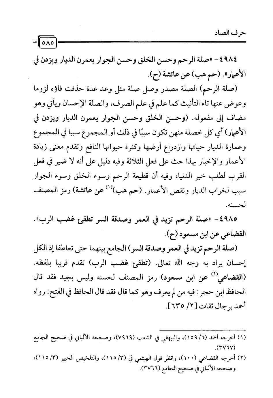 4984 - "صلة الرحم وحسن الخلق وحسن الجوار يعمرن الديار ويزدن في الأعمار". (حم هب) عن عائشة (ح).