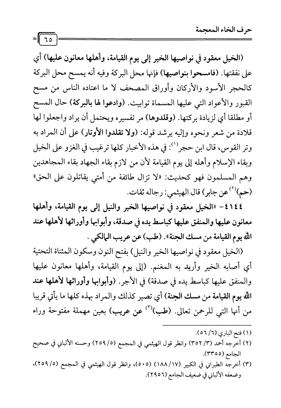 4144 - "الخيل معقود في نواصيها الخير والنيل إلى يوم القيامة وأهلها معانون عليها والمنفق عليها كباسط يده في صدقة، وأبوابها وأوراثها لأهلها عند الله يوم القيامة من مسك الجنة". (طب) عن عريب المالكي.