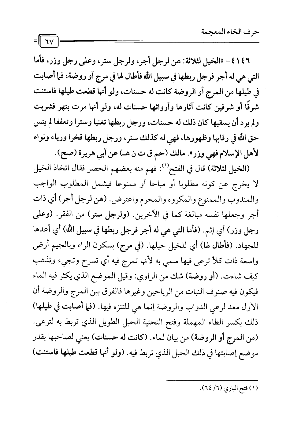 4146 - "الخيل لثلاثة: هن لرجل أجر، ولرجل ستر، وعلى رجل وزر، فأما التي هي له أجر فرجل ربطها في سبيل الله فأطال لها في مرج أو روضة، فما أصابت في طيلها من المرج أو الروضة كانت له حسنات، ولو أنها قطعت طيلها فاستنت شرفًا أو شرفين كانت آثارها وأرواثها حسنات له، ولو أنها مرت بنهر فشربت ولم يرد أن يسقيها كان ذلك له حسنات، ورجل ربطها تغنيا وسترا وتعففا لم ينس حق الله في رقابها وظهورها، فهي له كذلك ستر، ورجل ربطها فخرا ورياء ونواء لأهل الإِسلام فهي وزر". مالك (حم ق ت ن هـ) عن أبي هريرة (صح).