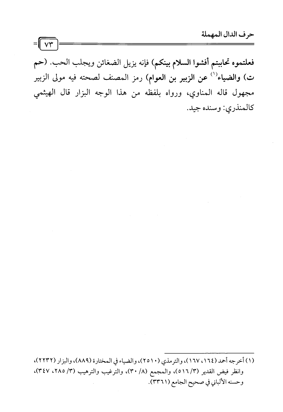 فعلتموه تحاببتم أفشوا السلام بينكم) فإنه يزيل الضغائن ويجلب الحب. (حم ت) والضياء (¬1) عن الزبير بن العوام) رمز المصنف لصحته فيه مولى الزبير مجهول قاله المناوي، ورواه بلفظه من هذا الوجه البزار قال الهيثمي كالمنذري: وسنده جيد.