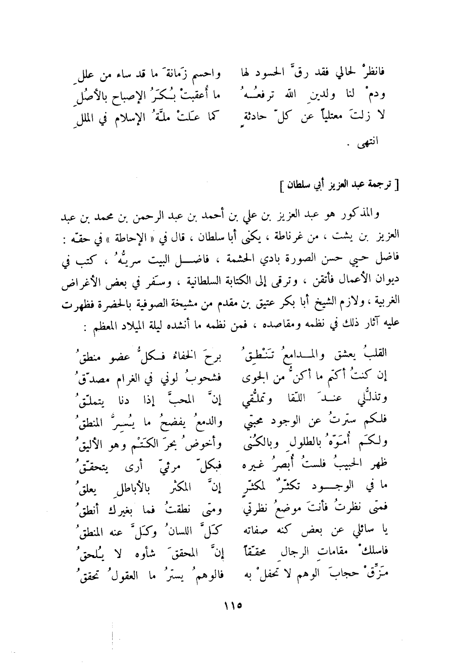 والمذكور هوعبد العزيز بن علي بن أحمد بن عبد الرحمن بن محمد بن عبد العزيز بن يشت، من غرناطة، يكنى أبا سلطان قال في " الإحاطة " في حقه: فاضل حيي حسن الصورة بادي الحشمة فاضل البيت سريه كتب في ديوان الأعمال فأتقن وترقى إلى الكتابة السلطانية وسفر في بعض الأغراض الغربية ولازم الشيخ أبا بكر عتيق بن مقدم من مشيخة الصوفية بالحضرة فظهرت عليه آثار ذلك في نظمه ومقاصده فمن نظمه ومقاصده فمن نظمه ما أنشده ليلة الميلاد المعظم: