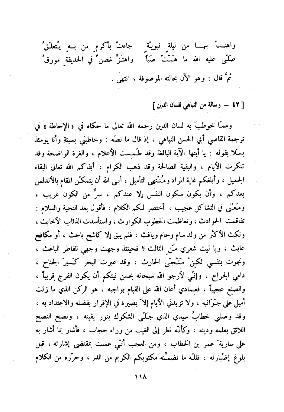 ومما خوطب به لسان الدين رحمه الله تعالى ما حكاه في الإحاطة في ترجمة القاضي أبي حسن النباهي إذ قال ما نصه وخاطبني بسبتة وأنا يومئذ بسلا بقوله يا أيتها الآية البالغة وقد طمست الأعلام والغرة الواضحة وقد تنكرت الأيام والبقية الصالحة وقد ذهب الكرام أبقاكم الله تعالى البقاء الجميل وأبلغكم غاية المراد ومنتهى التأميل أبي الله أن يتمكن المقام بالأندلس بعدكم وأن يكون سكون النفس إلا عندكم سرٌ من الكون غريب ومعنى في التشاكل عجيب أختصر لكم الكلام فأقول بعد التحية والسلام تفاقمت الحوداث وتعاظمت الخطوب والكوارث واستأسدت الذئاب الأخابث ونكث الأكثر من ولد سام وحام ويافث فلم يبق إلا كاشح باحث أومكافح عابث وياليت شعري من الثالث فحينئذ وجهت وجهي للفاطر البعث ونجوت بنفسي لكن منجى الحارث وقد عبرت البحر كسير الجناح دامي الجراح وإني لأرجوالله سبحانه بحسن نيتكم أن يكون الفرج قريباً والصنع عجيباً فعمادي أعان الله على القيام بواجبه هوالركن الذي مازلت أميل على جوانبه ولا تزيدني الأيام إلا بصيرة في الإقرار بفضله والاعتداد به وقد وصلني خطاب سيدي الذي جلى الشكوك بنور يقينه ونصح النصح اللائق بعلمه ودينه وكأنه نظر إلى الغيب من وراء حجاب فأشار بما أشار به على سارية عمر بن الخطاب ومن العجب أني علمت بمقتضى إشارته قبل بلوغ إضبارته فلله ما تضمنه مكتوبكم الكريم من الدر وحرره من الكلام