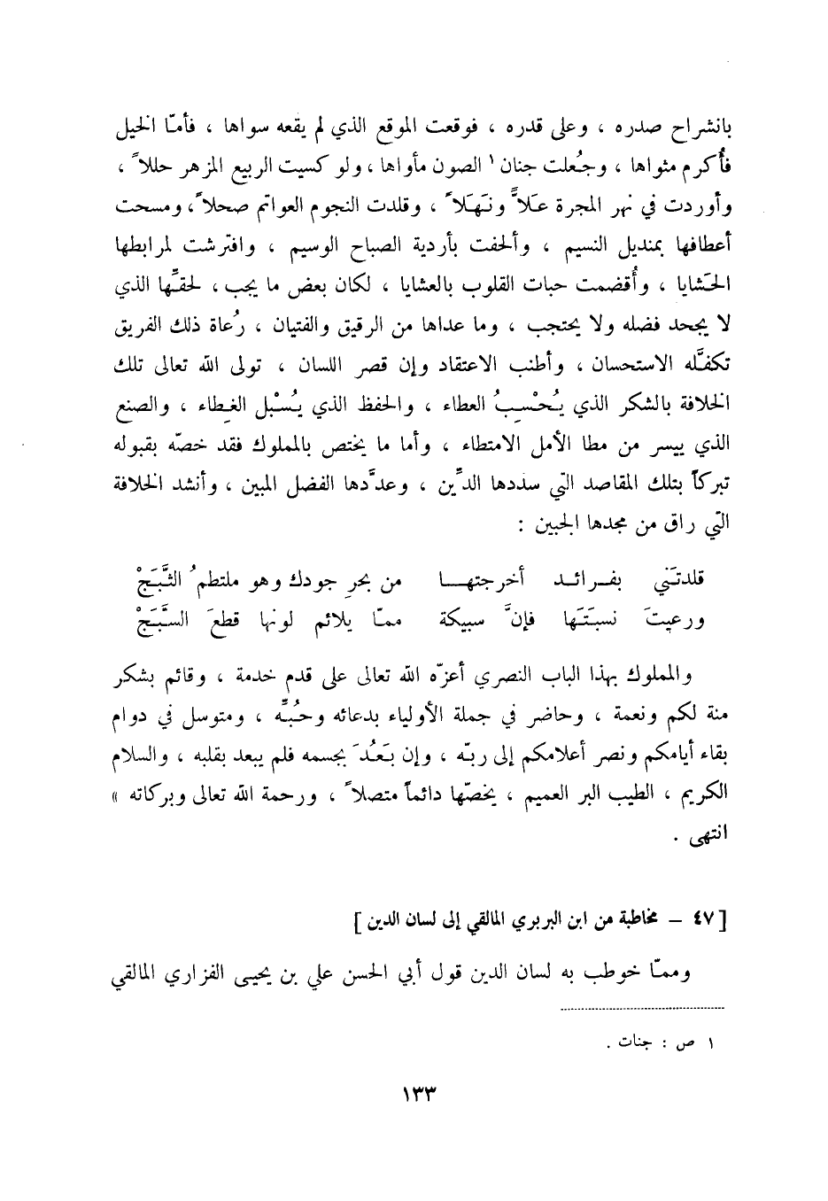 بانشراح صدره وعلى قدره فوقعت الموقع الذي لم يقع سواها فاما الخيل فأكرم مثواها وجعلت جنان (1) الصون مأواها ولوكسيت الربيع المزهر حللاً واوردت في نهر المجرة علاً ونهلاً وقلدت النجوم العواتم صحلاً ومسحت أعطافها بمنديل النسيم والحفت بأردية الصباح الوسيم وافترشت لمرابطها الحشايا وأقضمت حبات القلوب بالعشايا لكان بعض ما يجد لحقها الذي لا يجحد فضله ولا يحتجب وما عداها من الرقيق والفتيان رعاة ذلك الفريق تكفله الاستحسان وأطنب الاعتقاد وإن قصر اللسان تولى الله تعالى تلك الخلافة بالشكر الذي يحسب العطاء والحفظ الذي يسبل الغطاء والصنع الذي ييسر من مطا الأمل الامتطاء واما ما يختص بالملوك فقد خصه بقبوله تبركاً بتلك المقاصد التي سددها الدين وعددها الفضل المبين وأنشد الخلافة التي راق من مجدها الجبين: