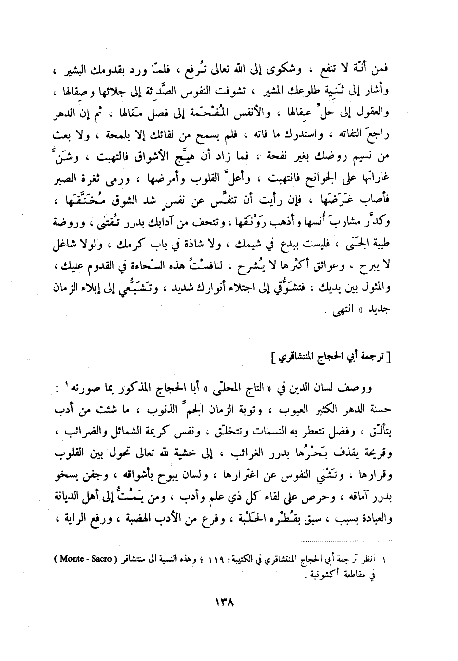 (1) انظر ترجمة أبي الحجاج المنتشاقري في الكتيبة: 119؛ وهذه النسبة إلى منتشاقر (Monte - Sacro) في مقاطعة أكشونية.