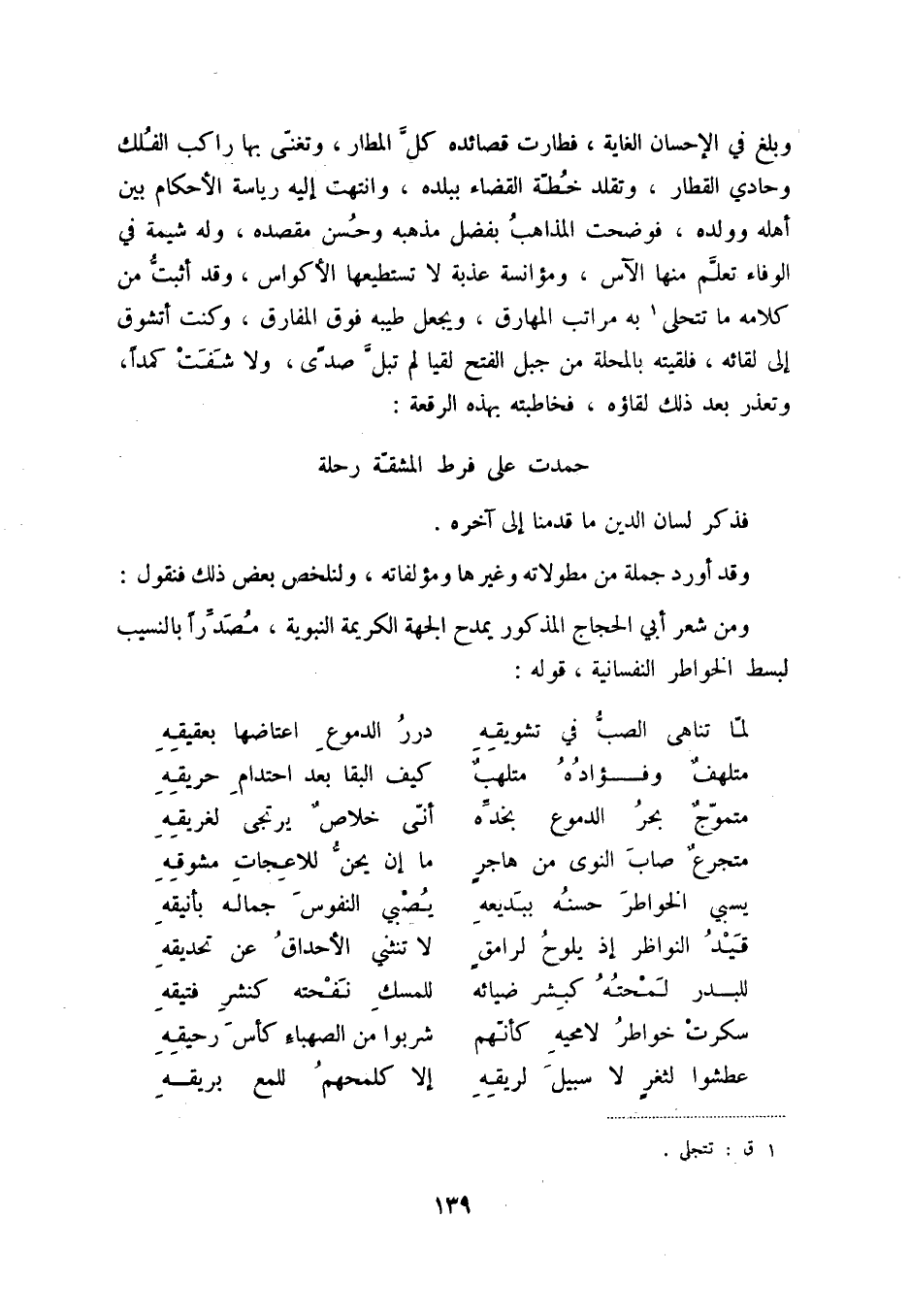 ومن شعر أبي الحجاج المذكور يمدح الجهة الكريمة النبوية، مصدراً بالنسيب لبسط الخواطر النفسانية، قوله: