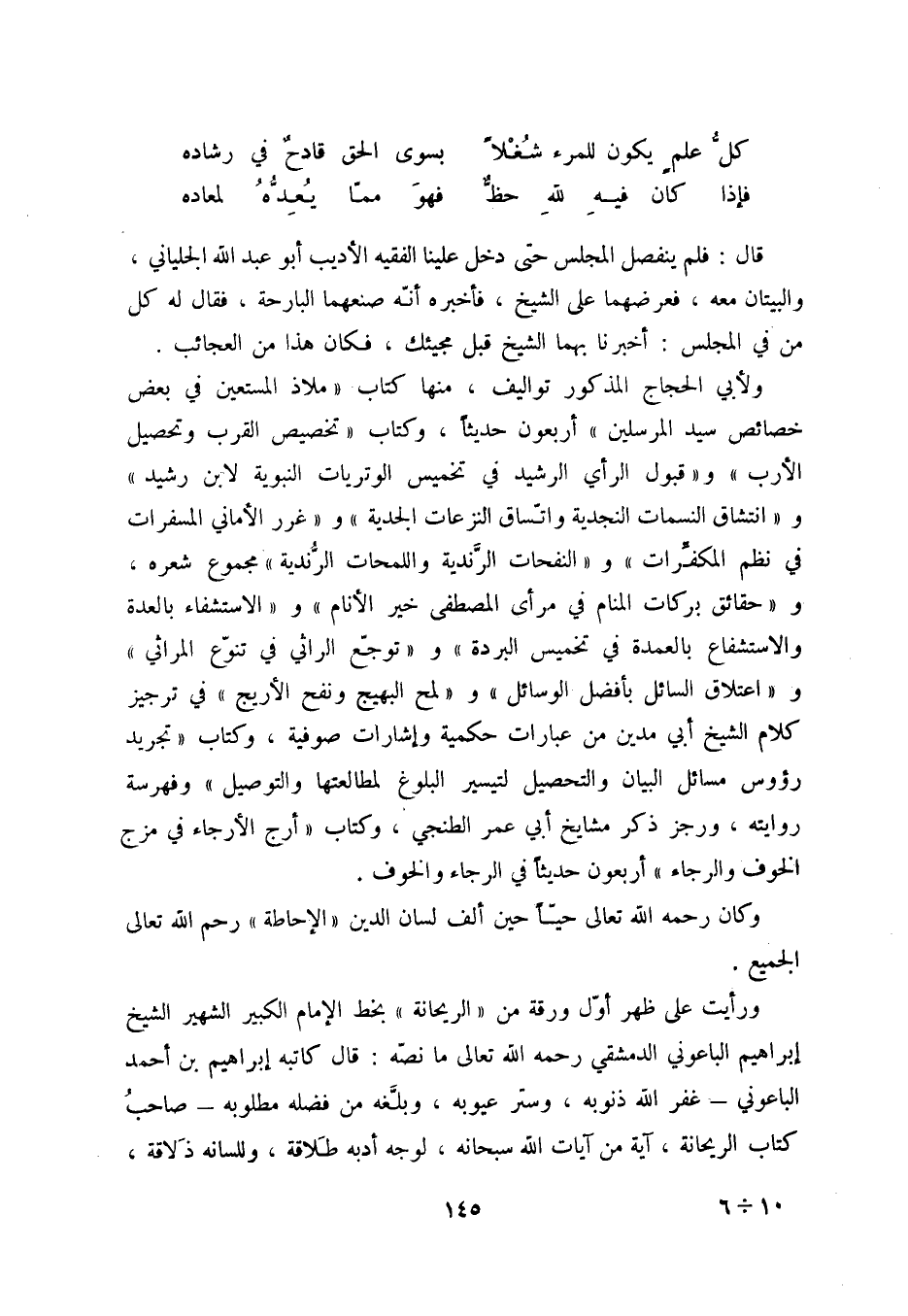 ورأيت على ظهر أول ورقة من الريحانة بخط الإمام الكبير الشهير الشيخ إبراهيم الباعوني الدمشقي رحمه الله تعالى ما نصه: قال كاتبه إبراهيم بن أحمد الباعوني - غفر الله ذنوبه - وستر عيوبه، وبلغه من فضله مطلوبه - صاحب كتاب الريحانة، آية من آيات الله سبحانه، لوجه أدبه طلاقه، وللسانه ذلاقة