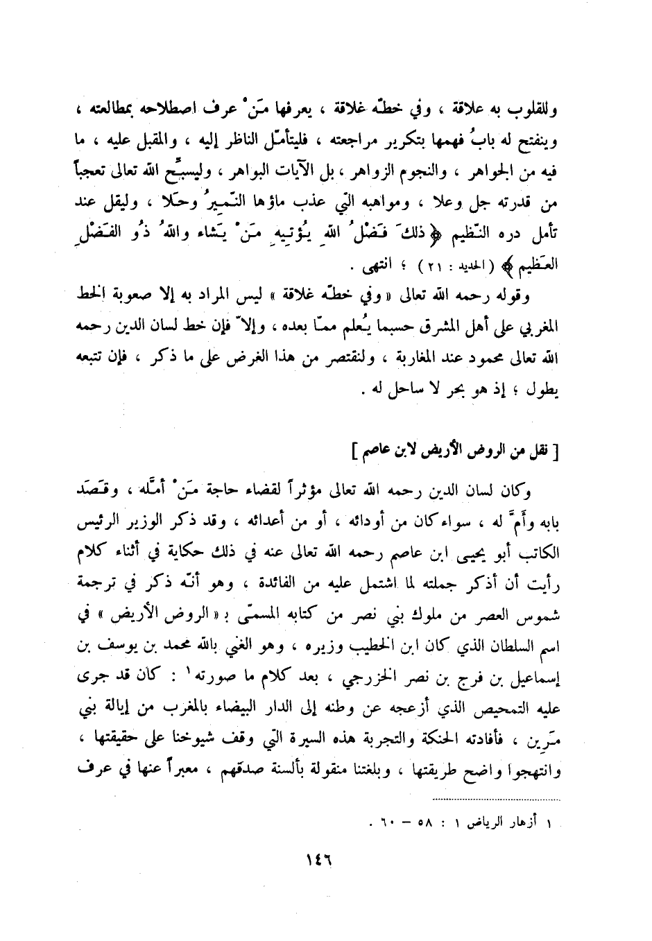 وقوله رحمه الله تعالى وفي خطه غلاقة ليس المراد به إلا صعوبة الخط المغربي على أهل المشرق حسبما يعلم مما بعده، وإلا فإن خط لسان الدين رحمه الله تعالى محمود عند المغاربة، ولنقتصر من هذا الغرض على ما ذكر، فإن تتبعه يطول؛ إذ هوبحر لا ساحل له.