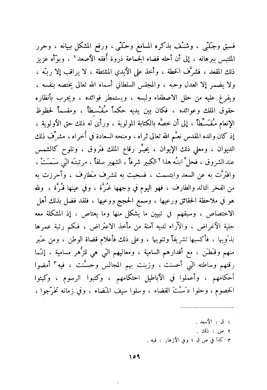 فسبق وجلى، وشنف بذكره المسامع وحلى، ورفع المشكل ببيانه، وحرر الملتبس ببرهانه، إلى أن أحله قضاء الجماعة ذروة أفقه الأصعد (1) ، وبوأه عزيز ذلك المقعد، فشرف الخطة، وأخذ على الأيدي المشتطة، لا يراقب إلا ربه، ولا يضمر إلا العدل وحبه، والمجلس السلطاني أسماه الله تعالى يختصه بنفسه، ويفرغ عليه من حلل الاصطفاء ولبسه، ويستمطر فزائده، ويجرب بأنظاره حقوق الملك وعوائده، فكان بين يديه حكماً مقسطاً، ومقسماً لحظوظ الإنعام مقسطاً، إلى أن خصه بالكتابة المولوية، ورأى له ذلك حق الأولوية، إذ كان والده المقدس نعم الله تعالى ثراه، ومنحه السعادة في أخراه، مشرف ذلك الديوان، ومعلي ذلك الإيوان، يحبر رقاع الملك فتروق، وتلوح كالشمس عند الشروق، فحل ابنه هذا (2) الكبير شرفاً، الشهير سلفاً، مرتبته التي سمت، وافترت به عن السعد وابتسمت، فسحبت به لشرف مطارف، وأحرزت به من الفخر التالد والطارف، فهواليوم في وجهها غرة، وفي عينها قرة، ولله هوفي ملاحظة الحقائق ورعيها، وسمع الحجج ووعيها، فلقد فضل بذلك أهل الاختصاص، وسبقهم في تبيين ما يشكل منها وما يعتاص، إذ المشكلة معه جلية الأغراض، والآراء لديه آمنة من مأخذ الاعتراض، فكم رتبة عمرها بذويها، فأكسبها تشريفاً وتنويهاً، وعلى ذلك فأعلام قضاة الوطن، ومن عبر منهم وقطن، مع أقدارهم السامية، ومعاليهم التي هي للزهر مسامية، إنما رقتهم وساطته التي أحسنت، وزينت بهم المجالس وحسنت، فيه (3) أمضوا أحكامهم، وأعلموا في الأباطيل احتكامهم، وكتبوا الرسوم، وكتبوا الخصوم، وحلوا دست القضاء، وسلوا سيف المضاء، وفي زمانه تخرجوا،