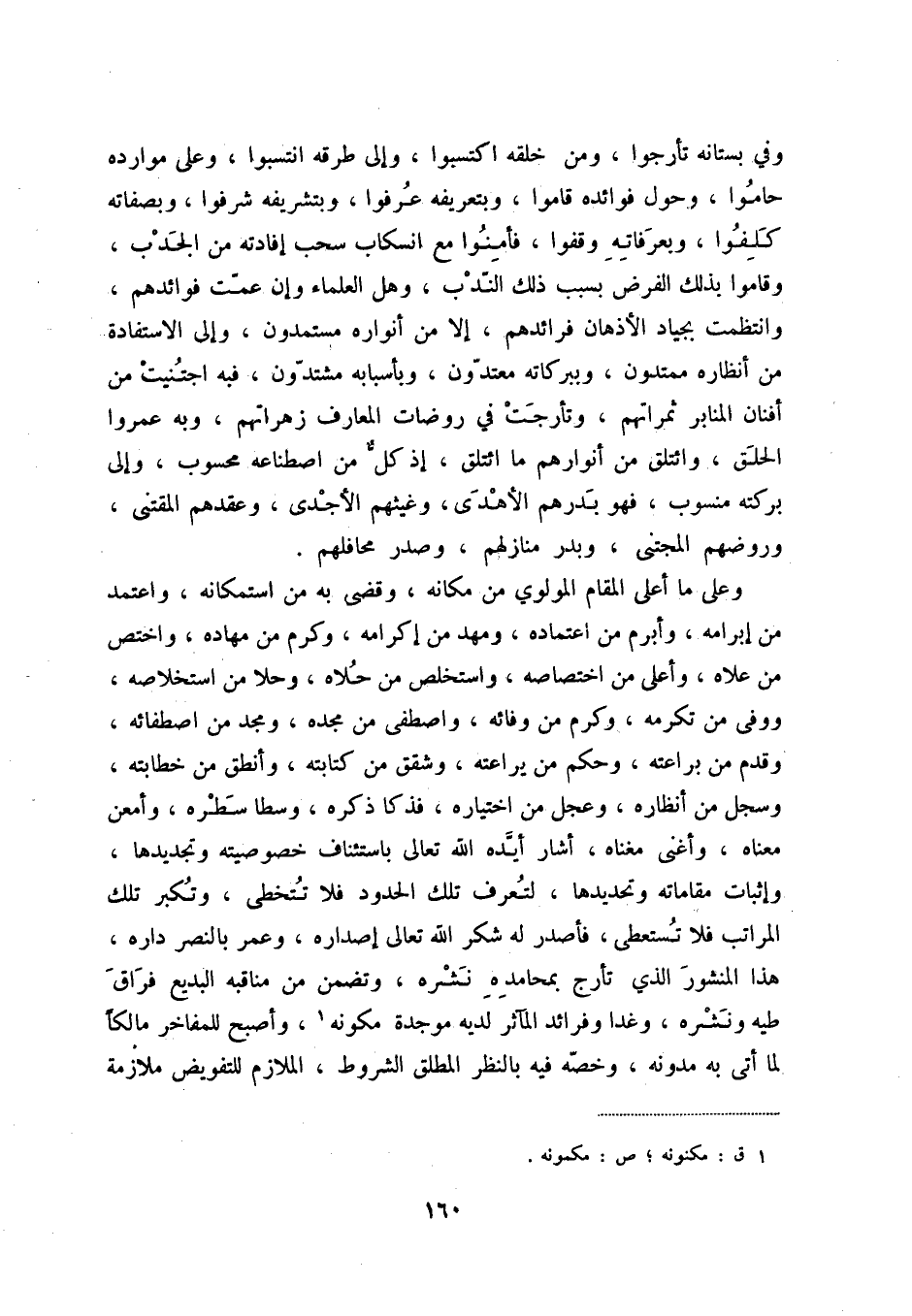 وعلى ما أعلى المقام المولوي من مكانه، وقضى به من استمكانه، واعتمد من إبرامه، وأبرم من اعتماده، ومهد من إكرامه، وكرم من مهاده، واختص من علاه، وأعلى من اختصاصه، واستخلص من حلاه،، وحلا من استخلاصه، ووفى من تكرمه، وكرم من يراعته، وشقق من كتابته، وأنطق من خطابته، وسجل من أنظاره، وعجل من اختياره، فذكا ذكره، وسطا سطره، وأمعن معناه، وأغنى مغناه، أشار أيده الله تعالى باستئناف خصوصيته وتجديدها، وإثبات مقاماته وتحديدها، لتعرف تلك الحدود فلا تتخطى، وتكبر تلك المراتب فلا تستعطى، فأصدر له شكر الله تعالى إصداره، وعمر من مناقبه البديع فراق طيه ونشره، وغدا وفرائد المآثر لديه موجدة مكونه (1) ، وأصبح للمفاخر مالكاً لما أتى به مدونه، وخصه فيه بالنظر المطلق الشروط، الملازم للتفويض ملازمة