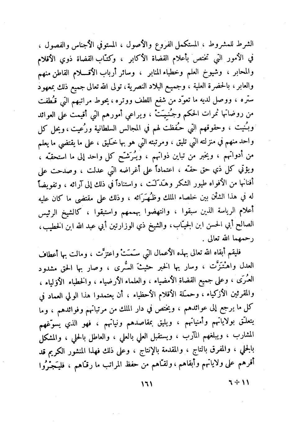 فليقم أبقاه الله تعالى بهذه الأعمال التي سمت واعتزت، ومالت بها أعطاف العدل واهتزت، وسار بها الخبر حثيث السرى، وصار بها الحق مشدود العرى، وعلى جميع القضاة الامضايء، والعلماء الأرضياء، والخطباء الأولياء، والمقرئين الأزكياء، وحملة الأقلام الأحظياء، أن يعتمدوا هذا الولي العماد في كل ما يرجع إلى عوائدهم، ويختص في دار الملك من مرتباتهم وفوائدهم، وما يتعلق بولاياتهم وأمنياتهم، ويليق بمقاصدهم ونياتهم، فهوالذي يسوغهم المشارب، ويبلغهم المآرب، ويستقبل العلي بالعلي، والعاطل بالحلي، والمشكل بالجلي، والمفرق بالتاج، والمقدمة بالإنتاج، وعلى ذلك فهذا المنشور الكريم قد أقرهم على ولاياتهم وأبقاهم، ولقاهم من حفظ المراتب ما رقاهم، فليجروا