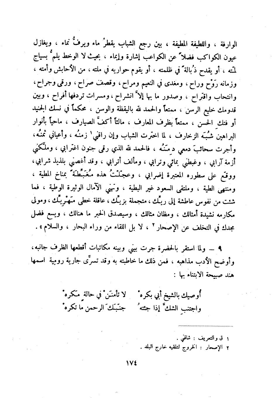 9 - ولما استقر بالحضرة جرت بيني وبينه مكاتبات أقطعها الظرف جانبه، وأوضح الأدب مذاهبه، فمن ذلك ما خاطبته به وقد تسري جارية رومية اسمها هند صبيحة الابتناء بها: