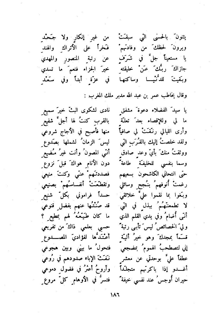 وبقيت للدنيا وساكنها ... في عزة أبداً وفي سعد وقال يخاطب عمر بن عبد الله مدير ملك المغرب: