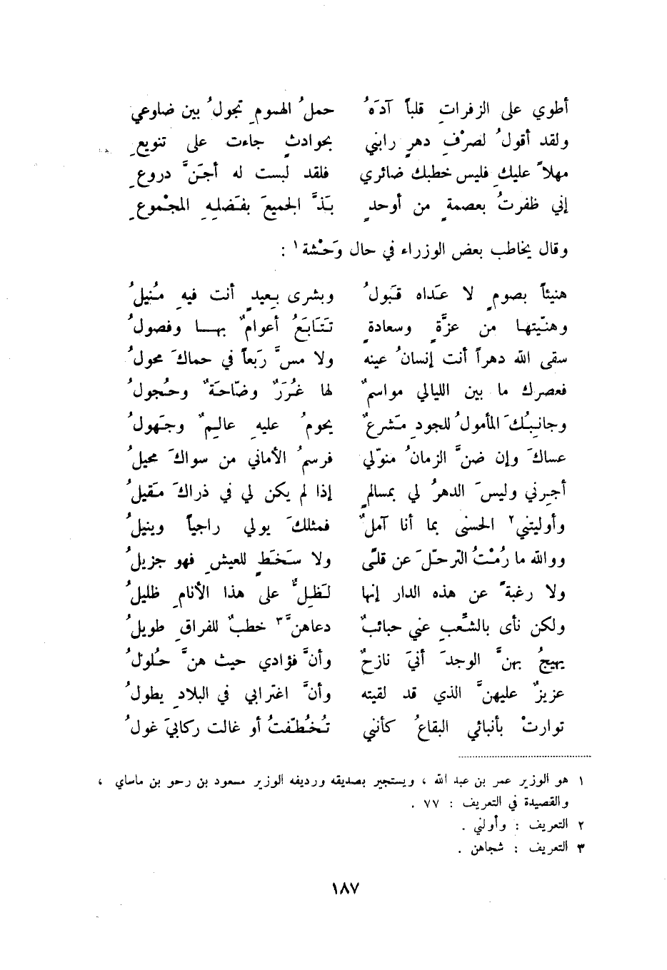 (1) هو الوزير عمر بن عبد الله، ويستجير بصديقه ورديفه مسعود بن رحو بن ماساي، والقصيدة في التعريف: 77.