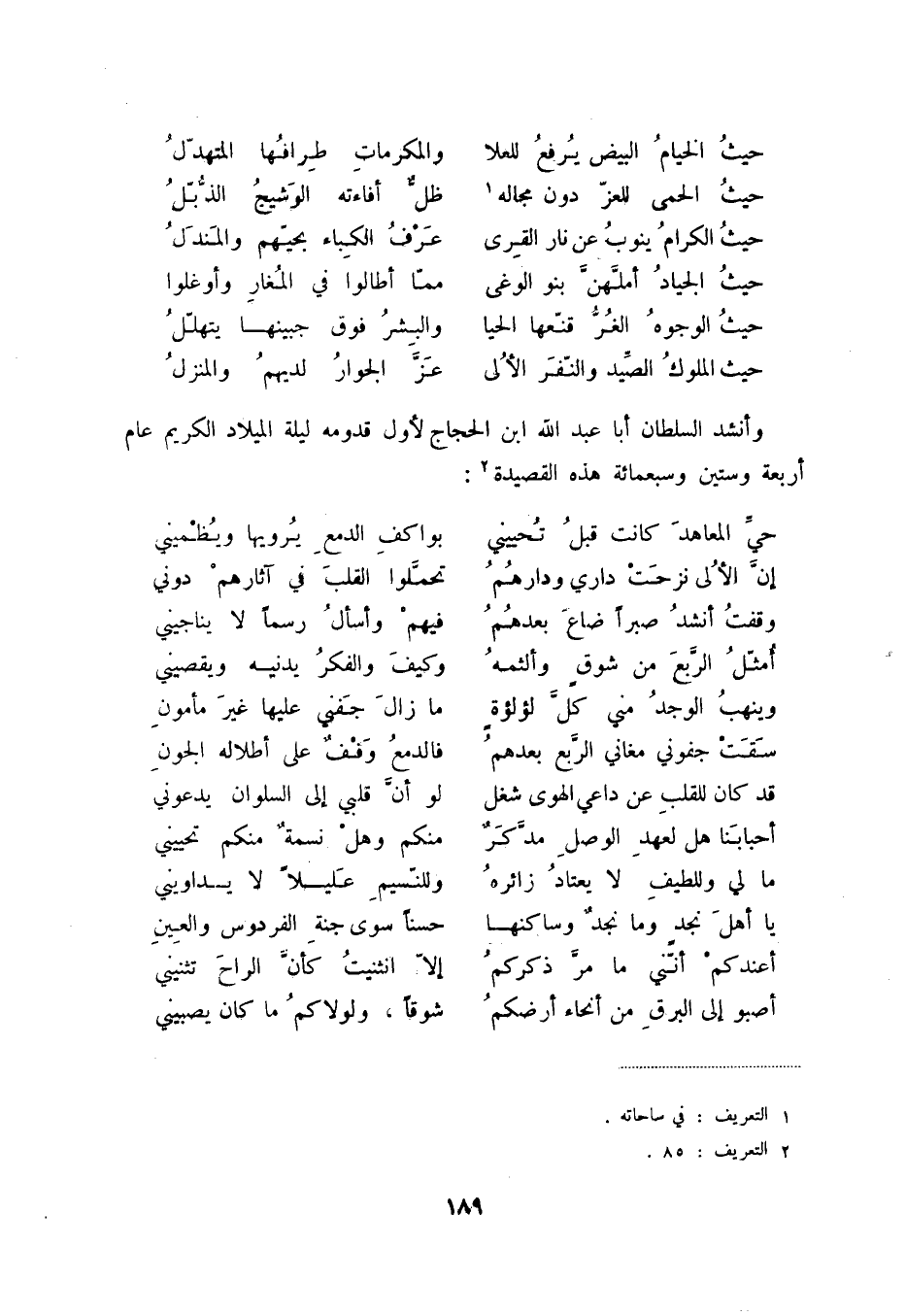 حيث الملوك الصيد والنفر الألى ... عز الجوار لديهم والمنزل وأنشد السلطان ابن عبد الله ابن الحجاج لأول قدومه ليلة الميلاد الكريم عام أربعة وستين وسبعمائة هذه القصيدة (2) :