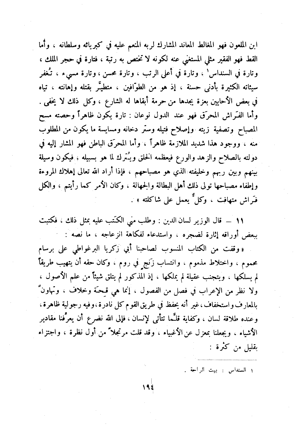 ابن الملعون فهوالمغالط المعاند المشارك لربه المنعم عليه في كبريائه وسلطانه، وأما القط فهوالفقير مثلي المستغني عنه لكونه لا تختص به رتبة، فتارة في حجر الملك، وتارة في السنداس (1) ، وتارة في أعلى الرتب، وتارة محسن، وتارة مسيء، تغفر سيئاته الكثيرة بأدنى حسنة، إذ هومن الطواقين، متطير بقتله وإهانته، تياه في بعض الأحايين بعزة يجدها من حرمة أبقاها له الشارع، وكل ذلك لا يخفى. وأما الفراش المحرق فهوعند الدول نوعان: تارة يكون ظاهراً وحصته مسح المصباح وتصفية زيته وإصلاح فتيله وستر دخانه ومسايسة ما يكون من المطلوب منه، ووجود هذا شديد الملازمة ظاهراً، وأما المحرق الباطن فهوالمشار إليه في دولته بالصلاح والزهد والورع فيعظمه الخلق ويترك لما هوبسبيله، فيكون وسيلة بينهم وبين ربهم وخليفته الذي هومصباحهم، فإذا أراد الله تعالى إهلاك المروءة وإطفاء مصباحها تولى ذلك أهل البطالة والجهالة، وكان الأمر كما رأيتم، والكل فراش متهافت، وكل يعمل على شاكلته ".