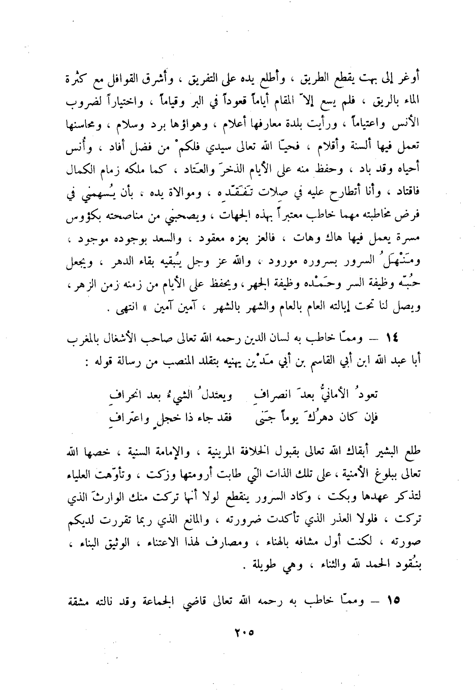 أوغر إلى بهت يقطع الطريق، وأطلع يده على التفريق، وأشرق القوافل مع كثرة الماء بالريق، فلم يسع إلا المقام أياماً قعوداً في البر وقياماً، واختياراً لضروب الأنس واعتياماً، ورأيت بلدة معارفها أعلام، وهواؤها برد وسلام، ومحاسنها تعمل فيها ألسنة وأقلام، فحيا الله تعالى سيدي فلكم من فضل أفاد، وأنس أحياه وقد باد، وحفظ منه على الأيام الذخر والعتاد، كما ملكه زمام الكمال فاقتاد، وأنا أتطارح عليه في صلات تفقده، وموالاة يده، بأن يسهمني في فرض مخاطبته مهما خاطب معتبراً بهذه الجهات، ويصحبني من مناصحته بكؤوس مسرة يعمل فيها هاك وهات، فالعز بعزه معقود، والسعد بوجوده موجود، ومنهل السرور بسروره مورود، والله عز وجل يبقيه بقاء الدهر، ويجعل حبه وظيفة السر وحمده وظيفة الجهر ويحفظ على الأيام من زمنه زمن الزهر، ويصل لنا تحت إيالته العام بالعام والشهر بالشهر، آمين آمين انتهى.