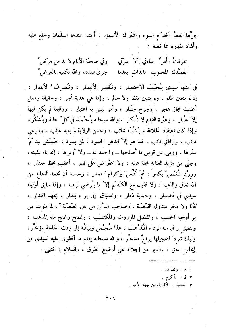 تعمدك المحبوب بالذات بعدما ... جرى ضده، والله يكفيه بالعرض في مثلها سيدي يحمد الاختصار، وتقصر الأنصار، وتصرف (1) الأبصار، إذ لم يتعين ظالم، ولم يتبين يقظ ولا حالم، وإنما هي هدية أجر، وحقيقة وصل أعقبت مجاز هجر، وجرح جبار، وأمر ليس به اعتبار، ووقيعة لم يكن فيها إلا غبار، وعثرة القدم لا تنكر، والله سبحانه يحمد في كل حالة ويشكر، وإذا كان اعتقاد الخلافة لم يشبه شائب، وحسن الولاية لم يعبه عائب، والرعي دائب، والجاني تائب، فما هوإلا الدهر الحسود، لمن يسود، خمش بيد ثم سترها، ورمى عن قوس ما أصلحها - والحمد لله - ولا أوترها، إنما باء بشينه، وجنى من مزيد العناية محنة عينه، ولا اعتراض على قدر، أعقب بحظ معتذر، وورد نغص بكدر، ثم أنس بإكرام (2) صدر، وحسبنا أن نحمد الدفاع من الله تعالى والذب، ولا نقول مع الكظم إلا ما يرضي الرب، وإذا سابق أولياء سيدي في مضمار، وحماية ذمار، واستباق إلى بر وابتدار، بجهد اقتدار، فأنا ولا فخر متناول القصبة، وصاحب الدين من بين العصبة (3) ، لما بلوت من بر أوجبه الحسب، والفضل الموروث والمكتسب، ونصح وضح منه المذهب، وتنفيق راق منه الرداء المذهب، هذا مجمل وبيانه إلى وقت الحاجة مؤخر، ونبذة شره لتعجيلها يراع مسخر، والله سبحانه يعلم ما أنطوي عليه لسيدي من إيجاب الحق، والسير على أوضح الطرق، والسلام؛ انتهى.