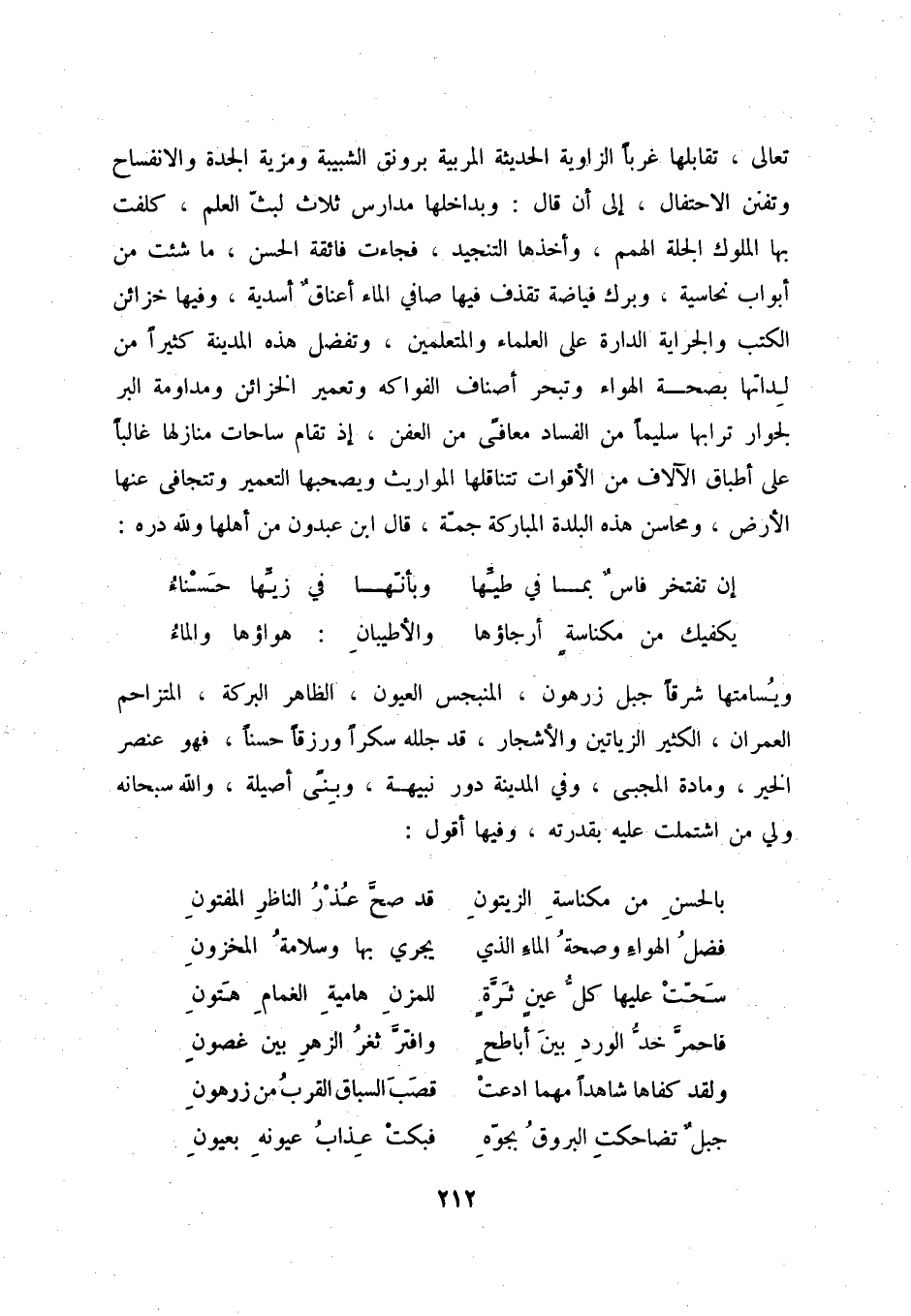 تعالى، تقابلها غرباً الزاوية الحديثة المربية برونق الشبيبة ومزية الجدة والانفساح وتفنن الاحتفال، إلى أن قال: وبداخلها مدارس ثلاث لبث العم، كلفت بها الملوك الجلة الهمم، وأخذها التنجيد، فجاءت فائقة الحسن، ماشئت من أبواب نحاسية، وبرك فياضة تقذف فيها صافي الماء أعناق أسدية، وفيها جزائن الكتب والجراية الدارة على العلماء والمتعلمين، وتفضل هذه المدينة كثيراً من لداتها بصحة الهواء وتبحر أصناف الفواكه وتعمير الخزائن ومداومة البر لجوار ترابها سليماً من الفساد معافىً من العفن، إذ تقام ساحات منازلها غالباً على أطباق الآلاف من الأقوات تتناقلها المواريث ويصحبها التعمير وتتجافى عنها الأرض، ومحاسن هذه البلدة المباركة جمة، قال ابن عبون من أهلها ولله دره: