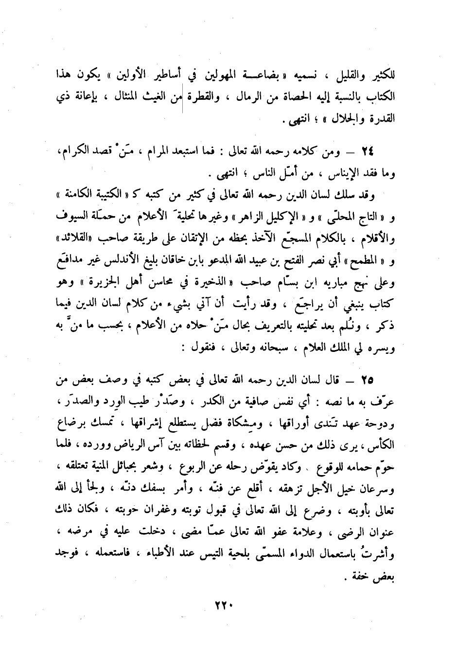 25 - قال لسان الدين رحمه الله تعالى في بعض في وصف بعض من عرف به ما نصه: أني نفس صافية من الكدر، وصدر طيب الورد والصدر، ودوحة عهد تندى أرواقها، ومشكاة فضل يستطلع إشراقها، تمسك برضاع الكأس، يرى ذلك من حسن عهده، وقسم لحظاته بين آس الرياض وورده، فلما حوم حمامه للوقوع، وكاد يقوض رحله عن الربوع، وشعر بحبائل المنية تعتلقه، وسرعان خيل الأجل تزهقه، أقلع عن فنه، وأمر بسفك دنه، ولجأ إلى الله تعالى بأوبته، وضرع إلى الله تعالى في قبول توبته وغفران حوبته، فكان ذلك عنوان الرضى، وعلامة عفوالله تعالى عما مضى، دخلت عليه في مرضه، وأشرت باستعمال الدواء المسمى بلحية التيس عند الأطباء، فاستعمله، فوجد بعض خفة.