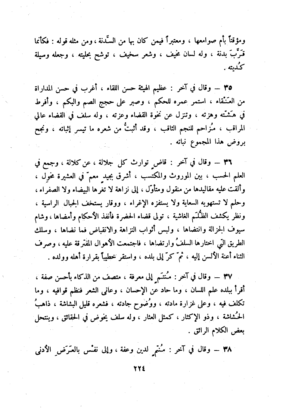 35 - وقال في آخر: عظيم الهيئة حسن اللقاء، أغرب في حسن المداراة من النقاء، استمر عمره للحكم، وصبر على حجج الصم والبكم، وأفرط في هشته وهزته، وتنزل عن نخوة القضاء وعزته، وله سلف في القضاء عالي المراقب، مزاحم للنجم الثاقب، وقد أثبت من شعره ما تيسر إثباته، ونجح بوض هذا المجموع نباته.