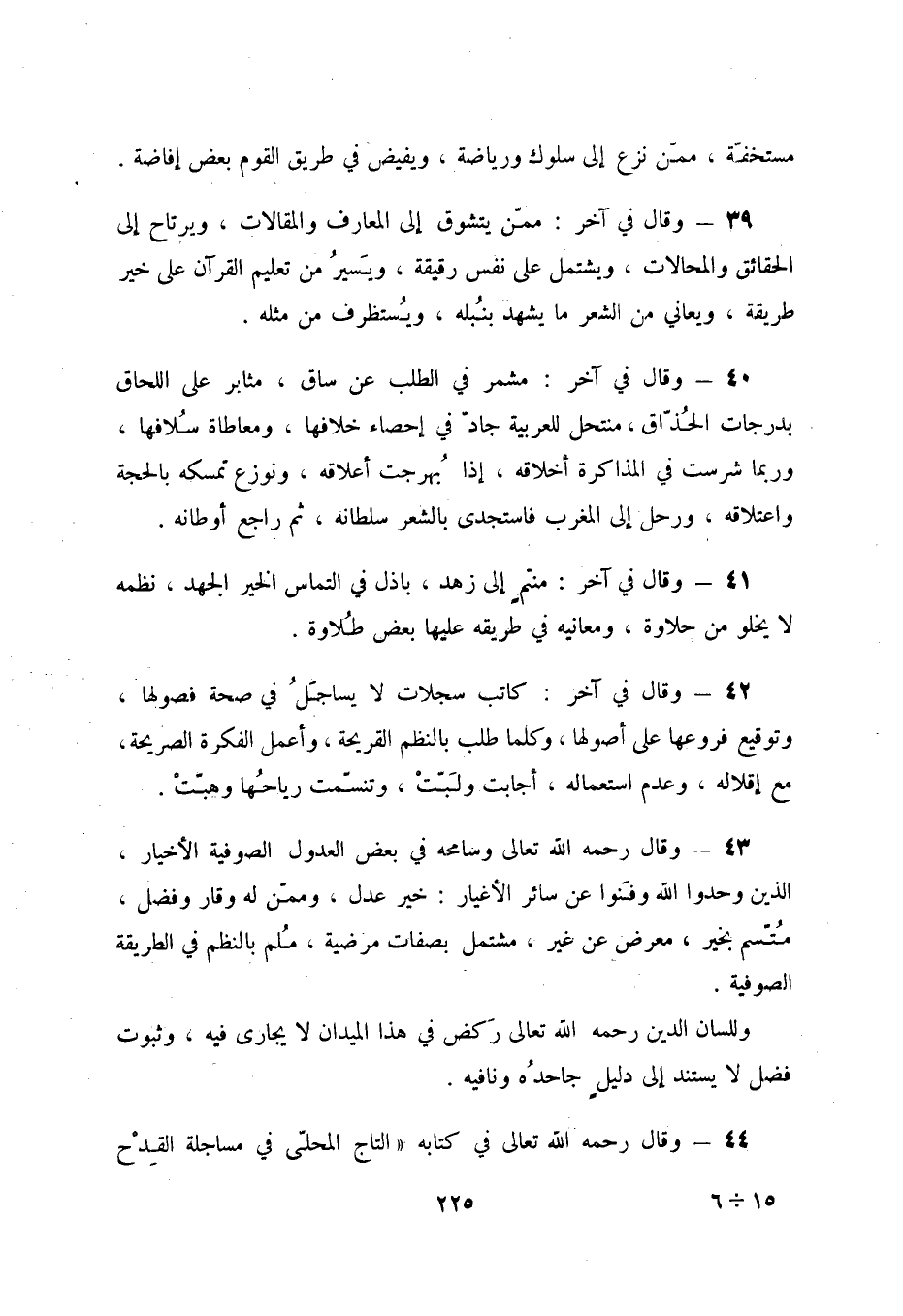 43 - وقال رحمه الله تعالى وسامحه في بعض العدول الصوفية الأخيار، الذين وحدوا الله وفنوا عن سائر الأغيار: خير عدل، وممن له وقار وفضل، متسم بخير، معرض عن غير، مستمل بصفات مرضية، ملم بالنظم في الطريقة الصوفية.
