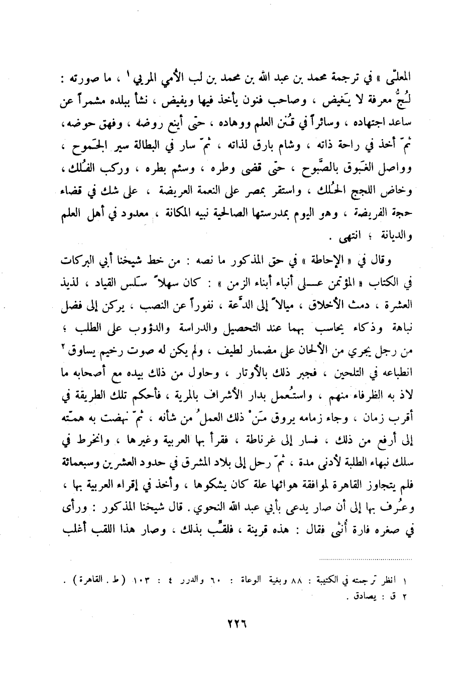 المعلى في ترجمة محمد بن عبد اللهبن محمد بن لب الأمي المربي (1) ، ما صورته لج معرفة لا يغيض، وصاحب فنون يأخذ فيها ويفيض، نشأ ببلده مشمراً عن ساعد اجتهاده، وسائراً في قنن العلم ووهاده، حتى أينع روضه، وفهق حوضه، ثم أخذ في راحة ذاته، وشام بارق لذاته، ثم سار في البطالة سير الجموح، وواصل الغبوق بالصبوح، حتى قضى وطره، وسئم بطره، وركب الفلك، وخاض اللجج الحلك، واستقر بمصر على النعمة العريضة، على شك في قضاء حجة الفريضة، وهواليوم بمدرستها الصالحية نبيه المكانة، معدود في أهل العلم والديانة؛ انتهى.