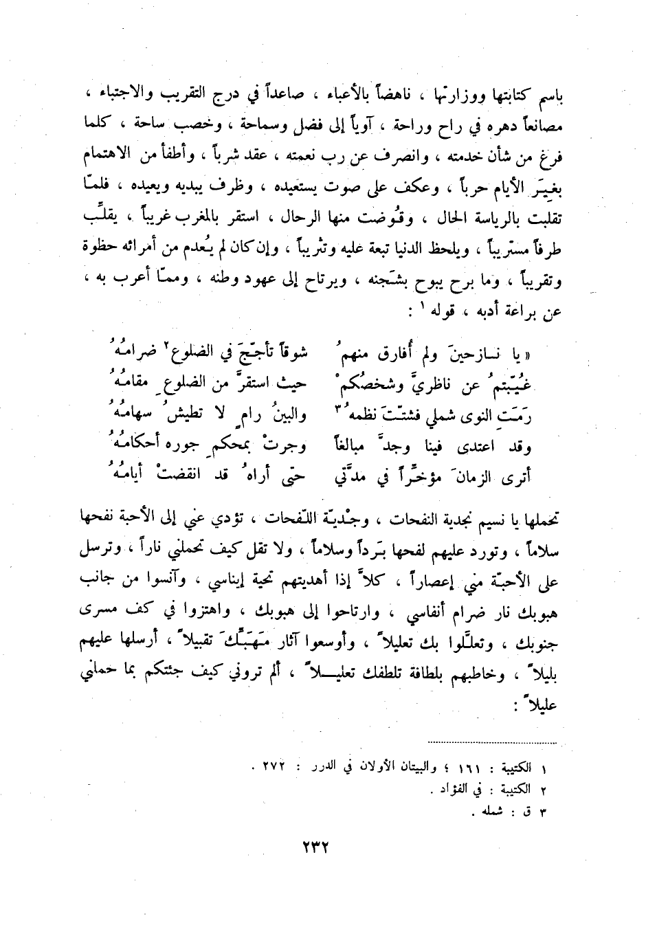 أترى الزمان مؤخراً في مدتي ... حتى أراه قد انقضت أيامه تحملها يا نسيم نجدية النفحات، وجدية اللفحات، تؤدي عني إلى الأحبة نفحها سلاماً وتورد عليهم لفحها برداً وسلاماً، ولا تقل كيف تحملني ناراً، وترسل على الأحبة مني إعصاراً، كلا إذا أهديتهم تحية إيناسي، وآنسوا من جانب هبوبك نار ضرام أنفاسي، وارتاحوا إلى هبوبك، واهتزوا في كف مسرى جنوبك، وتعللوا بك تعليلاً، وأوسعوا آثار مهبك تقبيلاً، أرسلها عليهم بليلاً، وخاطبهم بلطافة تلطفك تعلياً، ألم تروني كيف جئتكم بما حملني عليلاً: