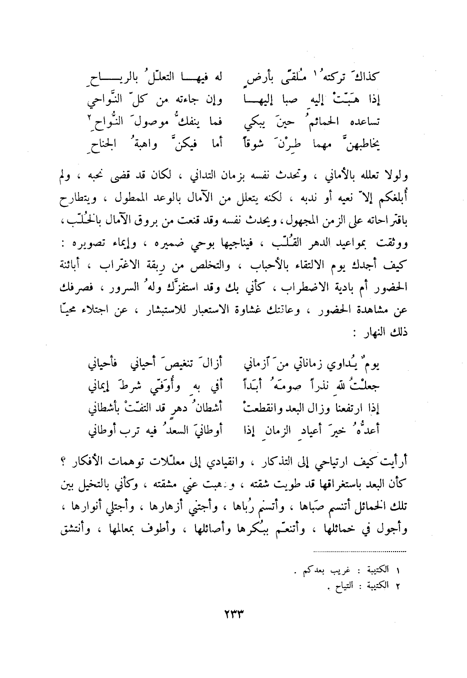 يخاطبهن مهما طرن شوقاً ... أما فيكن واهبة الجناح ولولا تعلله بالأماني، وتحدث نفسه بزمان التداني، لكان قد قضى نحبه، ولم أبلغكم إلا نعيه أوندبه، لكنه يتعلل من الآمال بالوعد الممطول، ويتطارح باقتراحاته على الزمن المجهول، ويحدث نفسه وقد قنعت من بروق الآمال بالخلب، ووثقت بمواعيد الدهر القلب، يناجيها بوحي ضميره، وإيماء تصويره: كيف أجدك يوم الالتقاء بالأحباب، والتخلص من ربقة الاغتراب، أبائنه الحضور أم بادية الاضطراب، كأني بك وقد استفزك وله السرور، فصرفك عن مشاهدة الحضور، وعاتك غشاوة الاستعبار للاستبشار، عن اجتلاء محيا ذلك النهار: