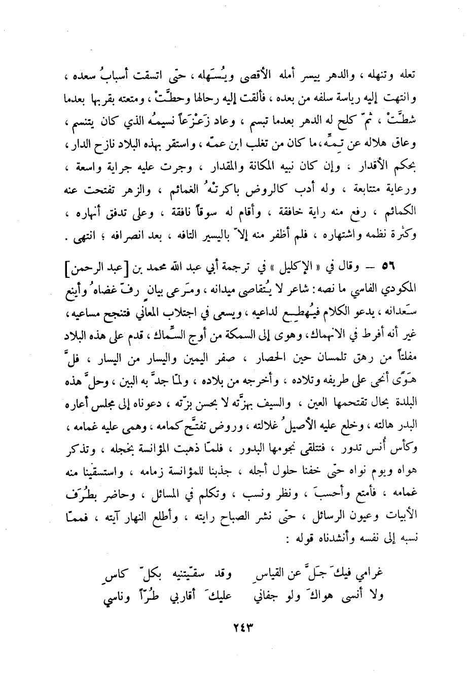 56 - وقال في " الإكليل " في ترجمة أبي عبد الله محمد بن عبد الرحمن المكودي الفاسي ما نصه: شاعر لا يتقاصى ميدانه، ومرعى بيان رف غضاه وأينع سعدانه، يدعوالكلام فيهطع لداعيه، ويسعى في اجتلاب المعاني فتنجح مساعيه، غير انه أفرط في الانهماك، وهوى إلى السمكة من أوج السماك، قدم على هذه البلاد مفلتاً من رهق تلمسان حين الحصار، صفر اليمين واليسار من اليسار، فل هوى أنحى على طريفه وتلاده، وأخرجه من بالده، ولما جد به البين، وحل هذه البلدة بحال تقتحمها العين، والسيف بهزته لا بحسن بزته، دعوناه إلى ملس أعاره البدر هالته، وخلع عليه الأصيل غلالته، وروض تفتح كمامه، وهمى عليه غمامه، وكاس أنس تدور، فتتلقى نجومها البدور، فلما ذهبت المؤانسة بخجله، وتذكر هواه ويوم نواه حتى خفنا حلول أجله، جذبنا للمؤانسة زمامه، واستسقينا منه غمامه، فامتع واحسب، ونظر ونسب، وتكلم في المسائل، وحاضر بطرف الأبيات وعيون الرسائل، حتى نشر الصباح رايته، وأطلع النهار آيته، فمما نسبه إلى نفسه وأنشدناه قوله: