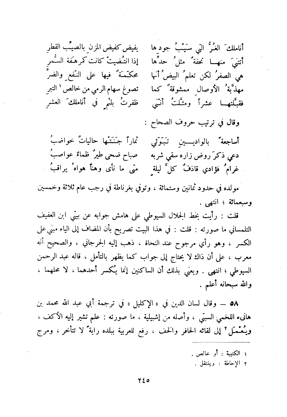 58 - وقال لسان الدين في الإكليل في ترجمة أبي عبد الله محمد بن هانئ اللخمي السبتي، وأصله من إشبيلية، ما صورته: علم تشير إليه الأكف، ويعمل (2) إلى لقائه الحافر والخف، رفع للعربية ببلده راية لا تتأخر، ومرج