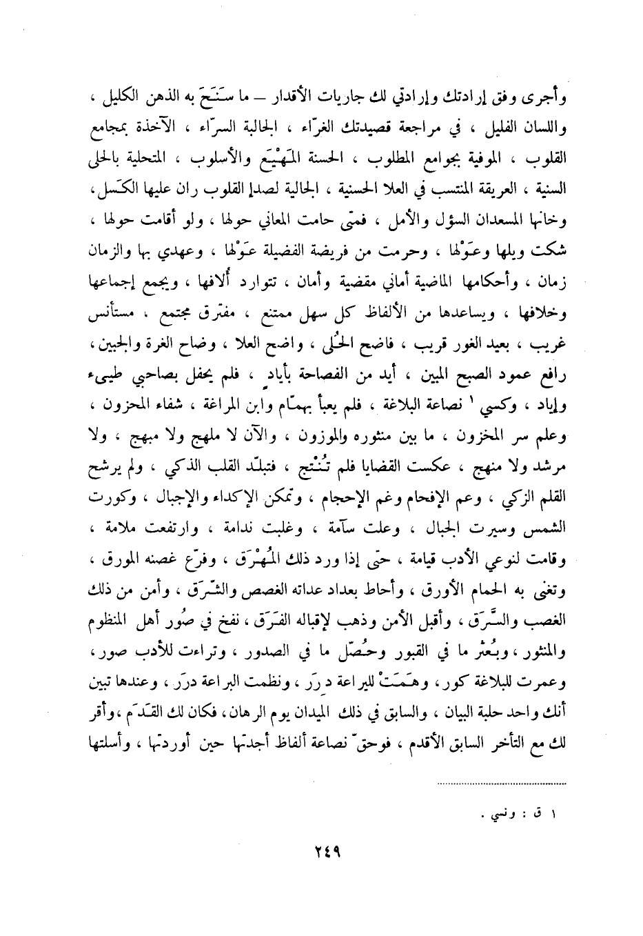 وأجرى وفق إرادتك وإرادتي لك جاريات الأقدار - ما سنح به الذهن الكليل، واللسان الفليل، في مراجعة قصيدتك الغراء، الجالبة السراء، الآخذة بمجامع القلوب، الموفية بجوامع المطلوب، الحسنة المهيع والأسلوب، الكتحلية بالحلى السنية، العريقة المنتسب في العلا الحسنية، الجالية لصدإ القلوب ران عليها الكسل، وخانها المسعدان السؤل والأمل، فمتى حامت المعاني حولها، ولوأقامت حولها، شكت ويلها وعولها، وحرمت من فريضة الفضيلة عولها، وعهدي بها والزمان زمان، وأحكامها الماضية أماني مقضية وأمان، تتوارد ألافها، ويجمع إجماعها وخلافها، ويساعدها من الألفاظ كل سهل ممتنع، مفترق مجتمع، مستأنس غريب، بعيد الغور قريب، فاضح الحلى، واضح العلا، وضاح الغرة والجبين، رافع عمود الصبح المبين، أيد من الفصاحة بأياد، فلم يحفل بصاحبي طيئ وإياد، وكسي (1) نصاعة البلاغة، فلم يعبأ بهمام وابن المراغة، شفاء المحزون، وعلم سر المحزون، ما بين منثوره والموزون، والآن لا ملهج ولا مبهج، ولا مرشد ولا منهج، عكست القضايا فلم تنتج، فتبلد القلب الذكي، ولم يرشح القلم الزكي، وعم الإفحام وغم الإحجام، وتمكن الإكداء والجبال، وكورت الشمس وسيرت الجبال، وعلت سآمة، وغلبت ندامة، وارتفعت ملامة، وقامت لنوعي الأدرب قيامة، حتى إذا ورد ذلك المهرق، وفرع غصنه المورق، وتغنى به الحمام الأورق، وأحاط بعداد عداته الغصص والشرق، وأمن من ذلك الغصب والسرق، وأقبل الامن وذهب لإقباله الفرق، نفخ في صور أهل المنظوم والمنثور، وبعثر ما في القبور وحصل ما في الصدور، وتراءت للأدب صور، وعمرت ببلاغة كور، وهممت لليراعة درر، ونظمت البراعة درر، وعندها تبين أنك واحد حلبة البيان، والسابق في ذلك الميدان يوم البرهان، فكان لك القدم، وأقر لك مع التأخر السابق الأقدم، فوحق نصاعة ألفاظ أجدتها حين أورتها، وأسلتها