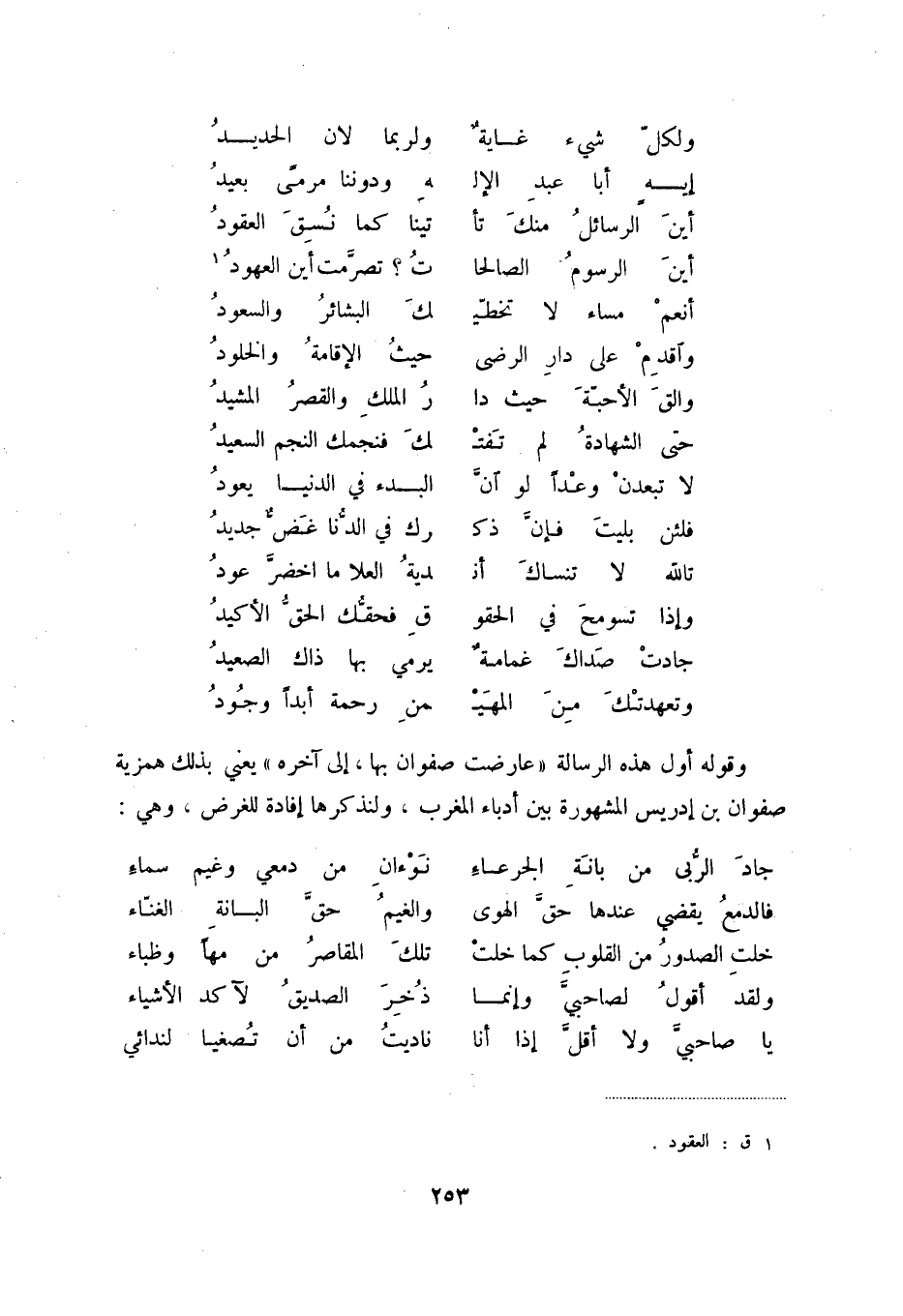 وتعهدتك من المهي ... من رحمة أبداً وجود وقوله أول هذه الرسالة عارضت صفوان بها، إلى آخره يعني بذلك همزية صفوان بن إدريس المشهورة بين أدباء المغرب، ولنذكرها إفادة للغرض، وهي: