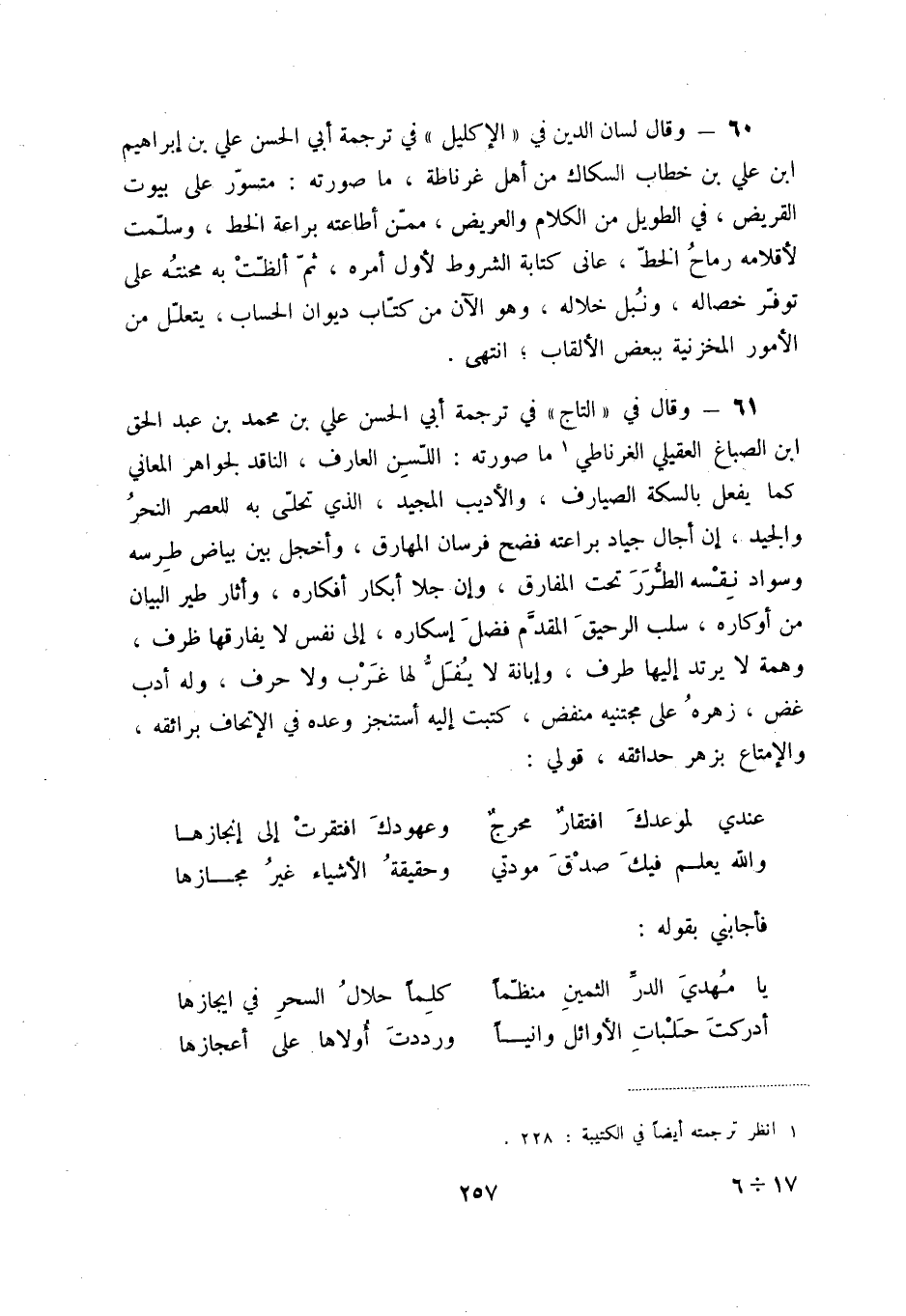 60 - وقال لسان الدين في " الإكليل " في ترجمة أبي الحسن علي بن إبراهيم ابن علي بن خطاب السكاك من أهل غرناطة، ما صورته: متسور على بيوت القريض، في الطويل من الكلام والعريض، ممن أطاعته براعة الخط، وسلمت لأقلامه رماح الخط، عانى كتابة الشروط لأول أمره، ثم ألظت به محنته على توفر خصاله، ونبل خلاله، وهوالآن من كتاب ديوان الحساب، يتعلل من الأمور المخزنية ببعض الألقاب؛ انتهى.