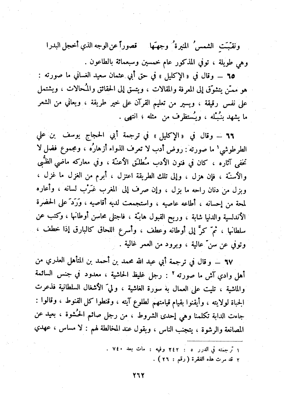 66 - وقال في " الإكليل " في ترجمة أبي الحجاج يوسف بن علي الطرطوشي (1) ما صورته: روض أدب لا تعرف الذواء أزهاره، ومجموع فضل لا تخفى آثاره، كان في فنون الأدب مطلق الأعنة، وفي معاركه ماضي الظبى والأسنة، فإن هزل، وإلى تلك الطريقة اعتزل، أبرم من الغزل ما غزل، وبزل من دنان راحه ما بزل، وإن صرف إلى المغرب غرب لسانه، وأعاره لمحة من إحسانه، أطاعه عاصيه، واستجمعت لديه أقاصيه، ورد على الحضرة الأندلسية والدنيا شابة، وريح القبول هابة، فاجتلى محاسن أوطانها، وكتب عن سلطانها، ثم كر إلى أوطانه وعطف، وأسرع اللحاق كالبارق إذا خطف، وتوفي عن سن علية، وبرود من العمر غالية.