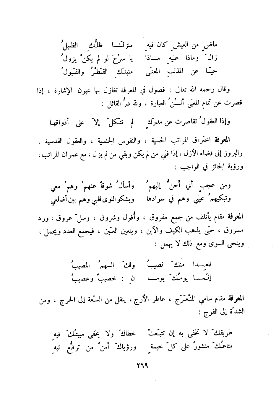 حيا عن المذنب المعنى ... منبتك القطر والقبول وقال رحمه الله تعالى: فصول في المعرفة تغازل بها عيون الإشارة، إذا قصرت عن تمام المعنى ألسن العبارة، ولله در القائل: