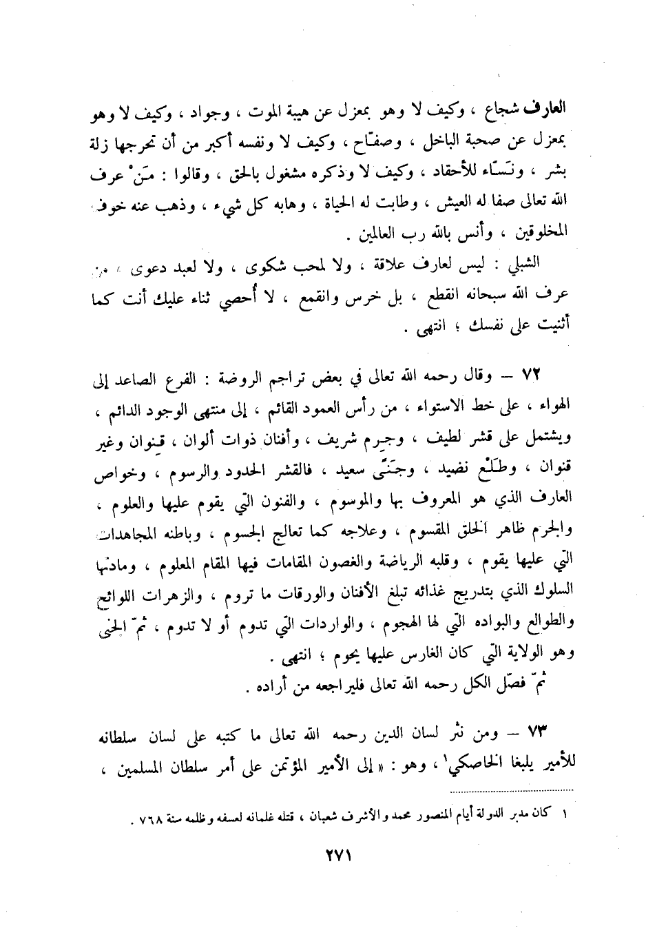 72 - قال رحمه الله تعالى في بعض تراجم الروضة: الفرع الصاعد إلى الهواء، على خط الاستواء، من رأس العمود القائم، إلى منتهى الوجود الدائم، ويشتمل على قشر لطيف، وجرم شريف، وأفنان ذوات قنوان وغير قنوان، وطلع نضيد، وجنىً سعيد، فالقشر الحدود والرسوم، وخواص العارف الذي هوبالمعروف بها والموسوم، والفنون التي يقوم عليها والعلوم، والجرم ظاهر الخلق المقسوم، وعلاجه كما تعالج الجسوم، وباطنه المجاهدات التي عليها يقوم، وقلبه الرياضة والغصون المقامات فيها المقام المعلوم، ومادتها السلوك الذي تدريج غذائه تبلغ الأفنان والورقات ما تروم، والزهرات اللوائح والطوالع والبواده التي لها الهجوم، والواردات التي تدوم أولا تدوم، ثم الجنى وهوالولاية التي كان الغارس عليها يحوم؛ انتهى.