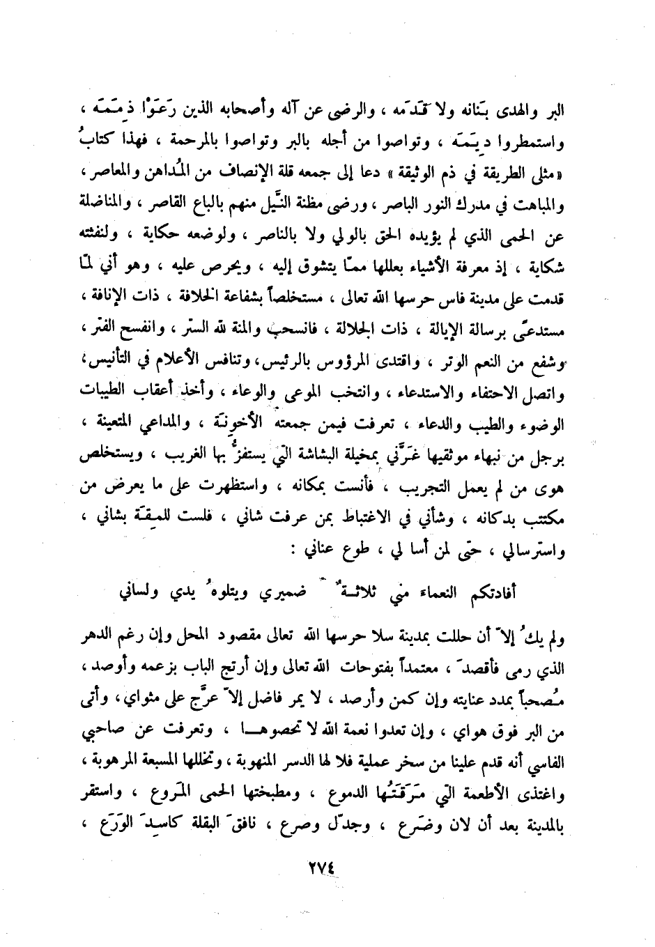 أفادتكم النعماء مني ثلاثة ... ضميري ويتلوه يدي ولساني ولم يك إلا أن حللت بمدينة سلا حرسها الله تعالى مقصود المحل وإن رغم الدهر الذي رمى فأقصد، معتمداً بفتوحات الله تعالى وإن أرتج الباب بزعمه وأوصد، مصحباً بمدد عنايته وإن كمن وأرصد، لا يمر فاضل إلا عرج على مثواي، وأتى من البر فوق هواي، وإن تعدوا نعمة الله لا تحصوها، وتعرفت عن صاحبي الفاسي أنه قدم علينا من سخر عملية فلا لها الدسر المنهوبة، وتخللها المسبعة المرهوبة، واغتذى الأطعمة التي مرقتها الدموع، ومطبختها الحمى المروع، واستقر بالمدينة بعد أن لان وضرع، وجدل وصرع، نافق البلقلة كاسد الورع