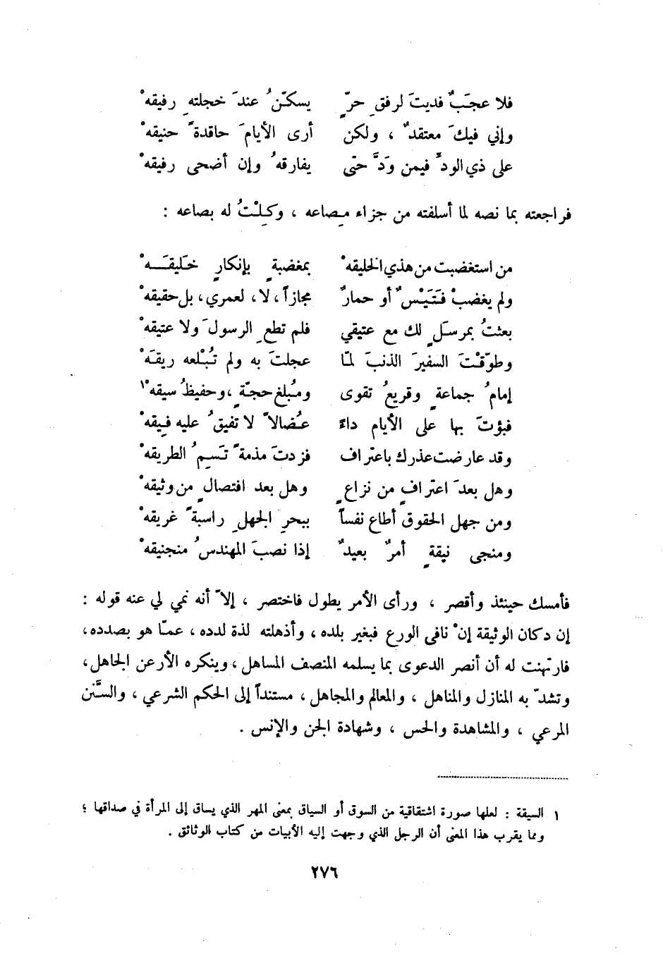 (1) السيقة: لعلها صورة اشتقاقية من السوق أو السياق بمعنى المهر الذي يساق لى المرأة في صداقتها؛ ومما يقرب هذا المعنى أن الرجل الذي وجهت إليه الأبيات من كتاب الوثائق.