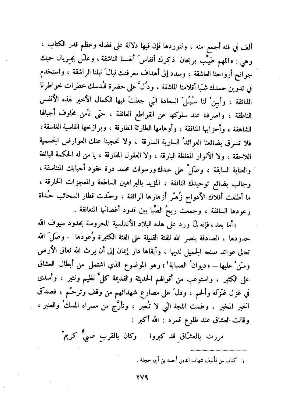 أما بعد فإنه لما ورد على هذه البلاد الأندلسية المحروسة بحدود سيوف الله حدودها، الصادقة بنصر الله للفئة القليلة على الفئة الكثيرة وعودها - وصل الله تعالى عوائد صنعه الجميل لديها، وأبقاها دار إيمان إلى أن يرث الله تعالى الأرض ومن عليها - " ديوان الصبابة (1) " وهوالموضوع الذي اشتمل من أبطال العشاق على الكثير، واستوعب من أقوالهم الحديثة والقديمة كل نظيم ونثير، وأسدى في غزل غزله وألحم، ودل على مصارع شهدائهم من وقف وترحم، فصدق الخبر المخبر، وطمت اللجة التي لا تعبر، وتأرج من مسراه المسك والعنبر، وقالت العشاق عند طلوع قمره: الله اكبر: