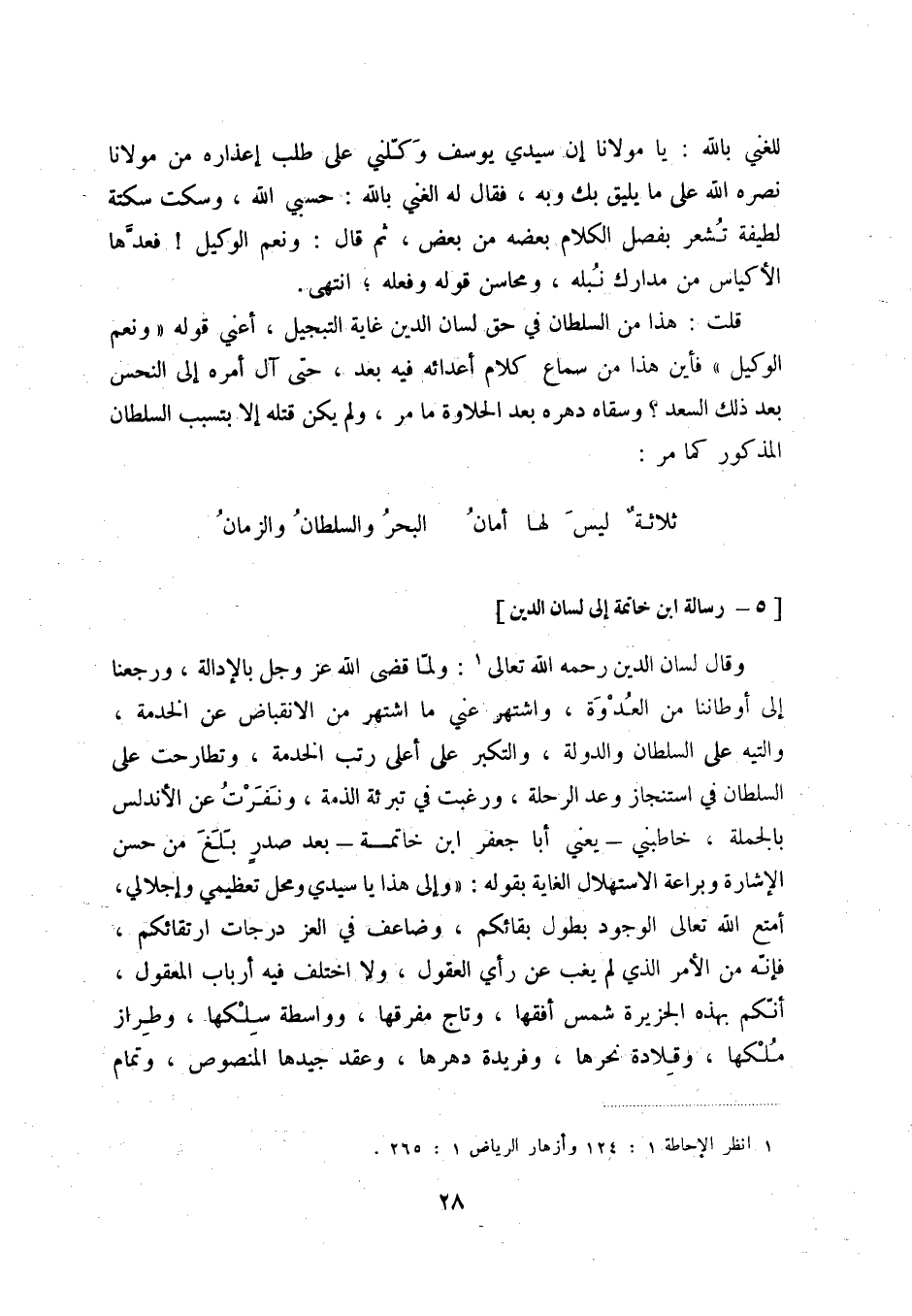 وقال لسان الدين رحمه الله تعالى (1) : ولما قضى الله عز وجل بالإدالة، ورجعنا إلى أوطاننا من العدوة واشتهر عني ما اشتهر من انقباض عن الخدمة والتيه على السلطان والدولة، والتكبر على أعلى رتب الخدمة، وتطارحت على السلطان في استنجاز وعد الرحلة، ورغبت في تبرئة الذمة، ونفرت عن الأندلس بالجملة، خاطبني يعني أبا جعفرابن خاتمة بعد صدر بلغ من حسن الإشارة وبراعة الاستهلال الغاية بقوله: وإلى هذا يا سيدي ومحل تعظيمي وإجلالي، أمتع الله تعالى الوجود بطول بقائكم، وضاعف في العز درجات ارتقائكم، فإنه من الأمر الذي لم يغب عن رأي العقول، ولا اختلف فيه أرباب المعقول، أنكم بهذه الجزيرة شمس أفقها، وتاج مفرقها، وواسطة سلكها، وطراز ملكها وقلادة نحرها، وفريدة دهرها، وعقد جيدها المنصوص، وتمام