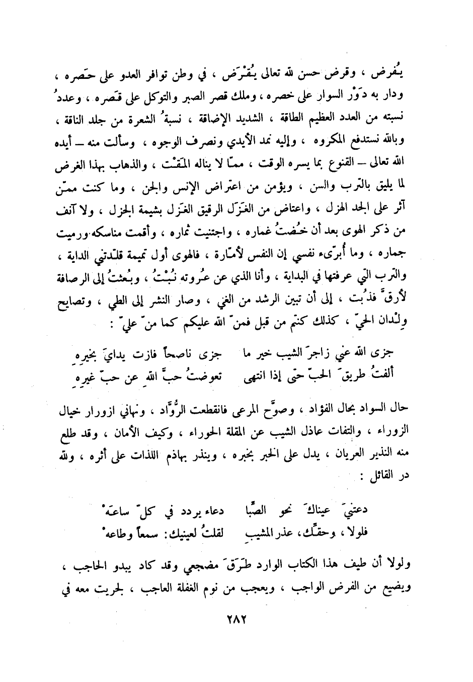 فلولا، وحقك عذر المشيب ... لقلت لعينيك: سمعاً وطاعه ولولا أن طيف هذا الكتاب الوارد طرق مضجعي وقد كاد يبدوالحاجب، ويضيع من الفرض الواجب، ويعجب من نوم الغفلة العاجب، لجريت معه في